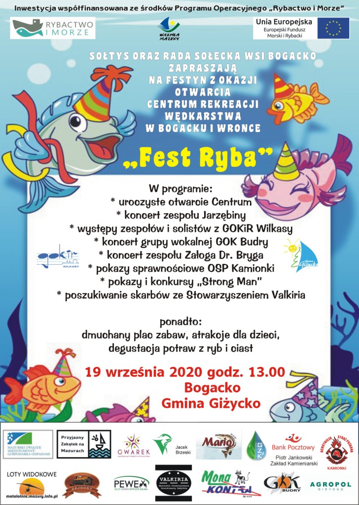 „Festyn Ryba” w Bogacku [ZAPOWIEDŹ] 15 września 2020019 września 2020 o godzinie 13.00 w pobliżu domków wielorodzinnych w Bogacku odbędzie się festyn „Fest Ryba”. Szczegóły wydarzenia na plakacie poniżej.