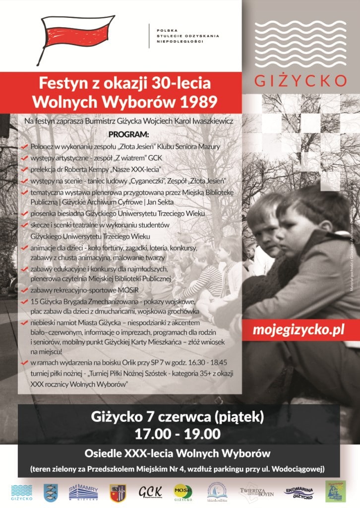 Miasto Giżycko włączając się w obchody 30. rocznicy Wolnych Wyborów z 4 czerwca 1989 zaprasza wszystkich giżycczan i sympatyków naszego miasta na festyn. Gwarantowane atrakcje dla całych rodzin, m.in. ciekawe prelekcje, animacje dla dzieci, dmuchańce, występy artystyczne.