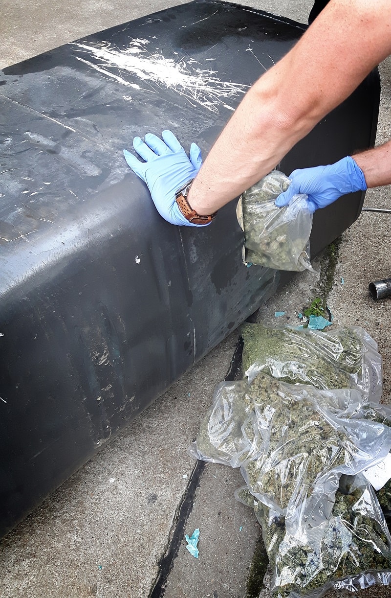 W wyniku przeszukania w dwóch kołach zapasowych i w zbiorniku paliwa, ujawniono 175 opakowań foliowych z zawartością suszu roślinnego, który po przebadaniu wskazał, że jest to marihuana.