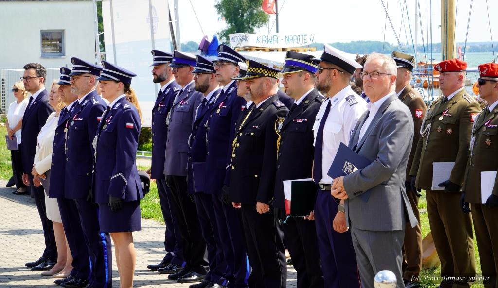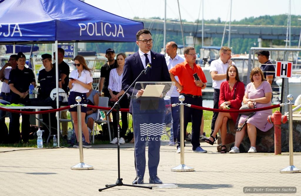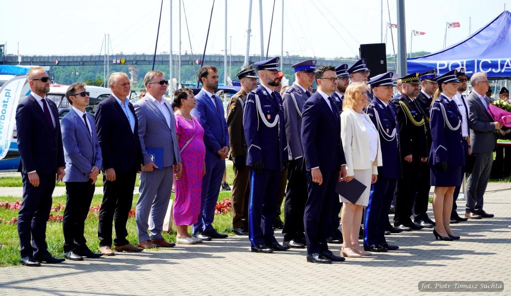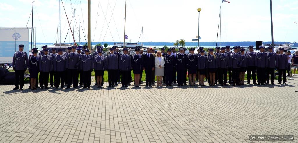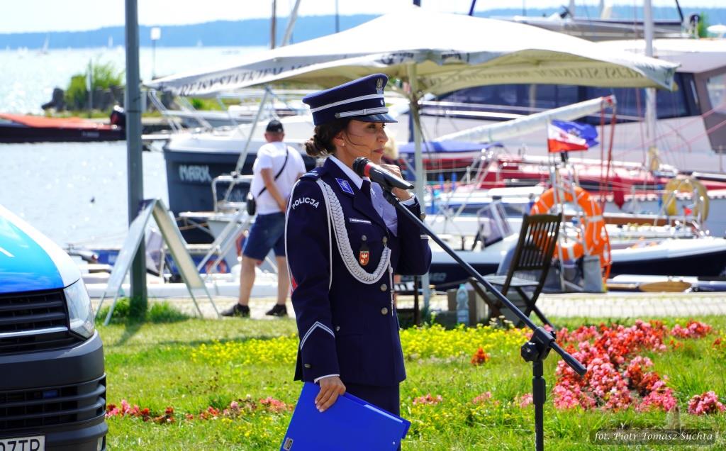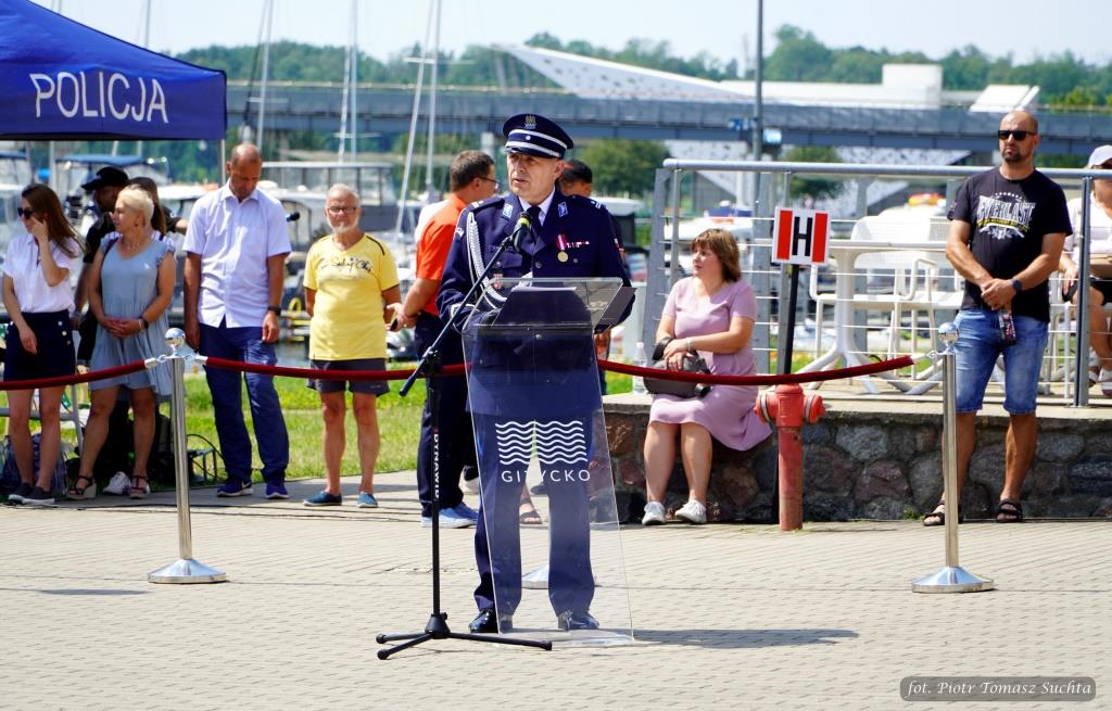 Na terenie portu Ekomarina w Giżycku policjanci obchodzili swoje święto. Z tej okazji odbył się uroczysty apel z udziałem I Zastępcy Komendanta Wojewódzkiego Policji w Olsztynie insp. Jarosławem Brzozowskim oraz zaproszonymi gośćmi.