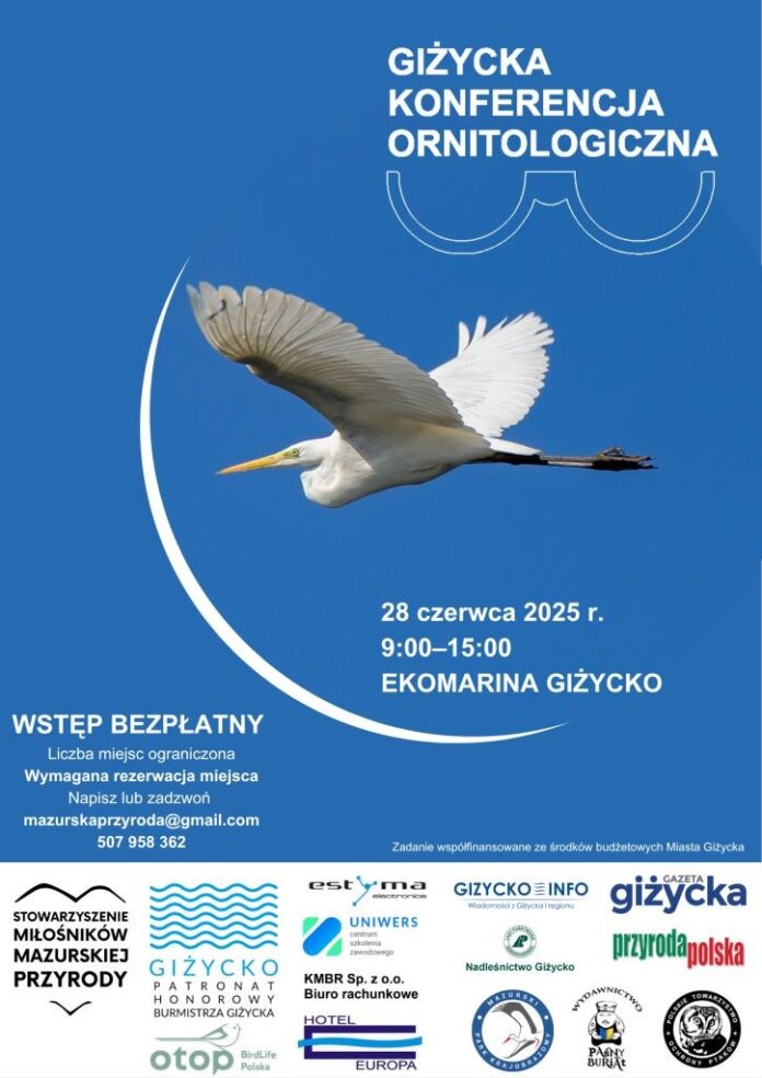 Wstęp i uczestnictwo w konferencji jest bezpłatne, jednak liczba miejsc ograniczona. Obowiązują zapisy. Zgłoszenia przyjmujemy pod nr tel: 507 958 362 lub email: mazurskaprzyroda@gmail.com Zadanie współfinansowane jest ze środków budżetowych Miasta Giżycka.