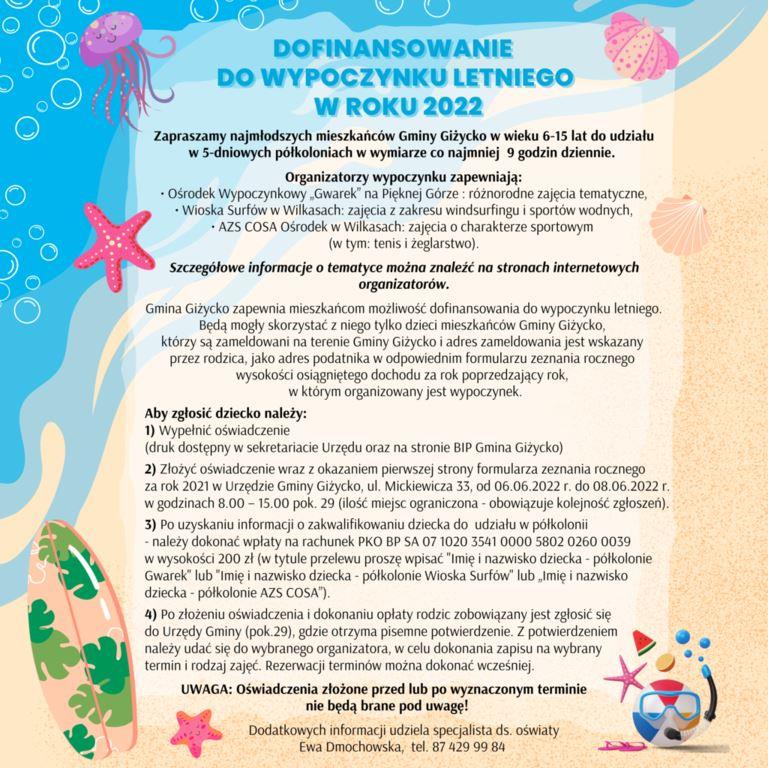 Zajęcia będą odbywać się przez 9 godzin dziennie. Są kierowane do dzieci mieszkańców gminy Giżycko, którzy mogą skorzystać z dofinansowania z gminnego budżetu. Ważne tylko, aby byli zameldowani na terenie gminy, a ich adres był wskazany jako adres podatnika w formularzu zeznania rocznego PIT.
