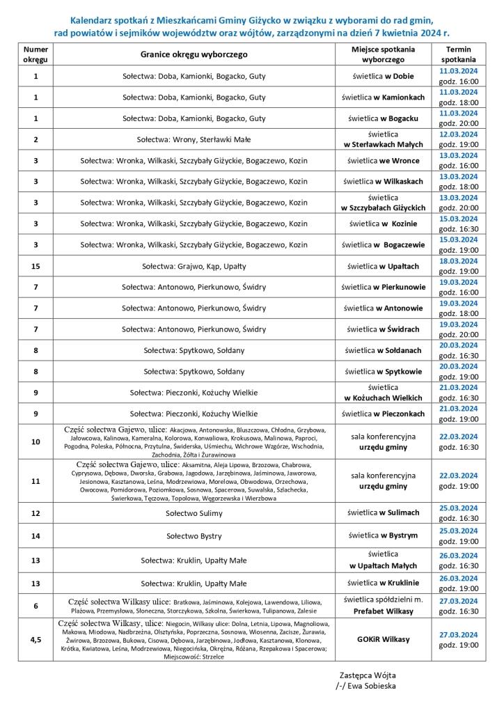 Kalendarz spotkań z Mieszkańcami Gminy Giżycko w związku z wyborami do rad gmin, rad powiatów i sejmików województw oraz wójtów, zarządzonymi na dzień 7 kwietnia 2024 r.