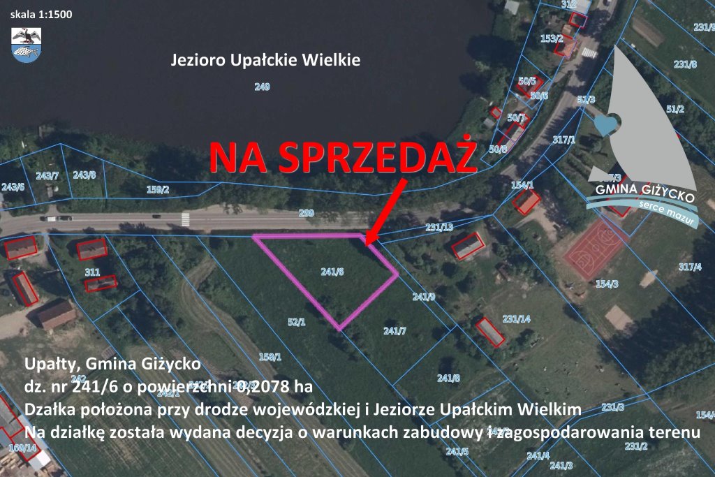 Gmina Giżycko ogłosiła przetarg na sprzedaż działki nr 241/6 o powierzchni 20,78 ara położonej w Upałtach przy drodze wojewódzkiej i Jeziorze Upałckim Wielkim.