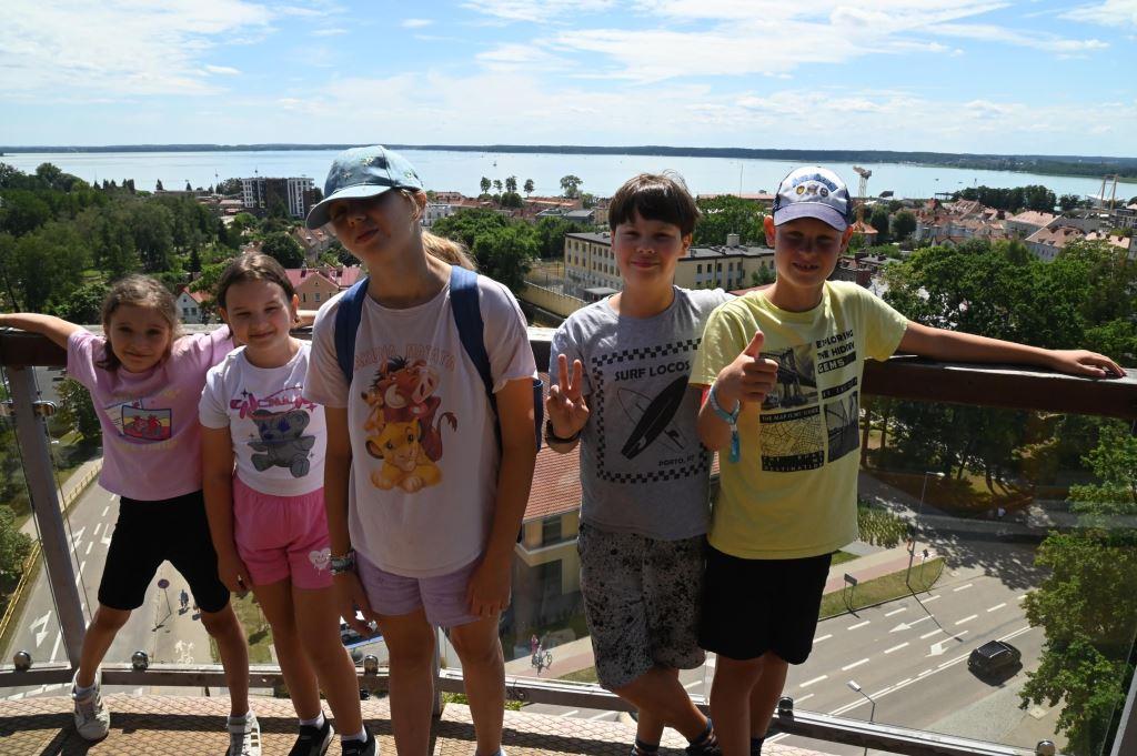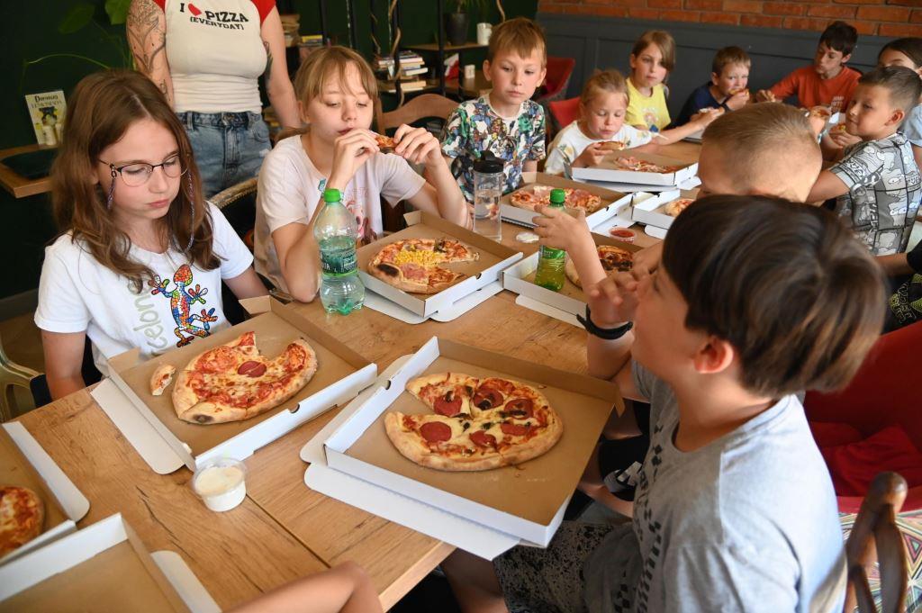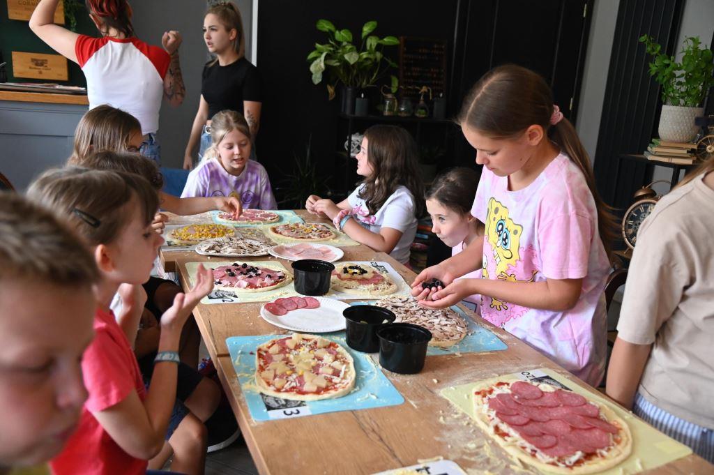 Pierwszy tydzień zakończyliśmy udaną wizytą w Parku Zwierząt w Wilkaskach. Pod okiem przewodnika nasza grupa karmiła urocze kózki i owce otrzymanymi od organizatorów marchewkami, oglądała skunksy, lemury, surogatki i pawie, zaprzyjaźniła się nawet z dwoma wielbłądami. Wyniesione z Parku wrażenia pozostaną im na długo w pamięci.  W kolejny poniedziałek dzieci stawiły się na warsztaty w Pizzerii Oregano. Na przygotowanych stanowiskach z numerkami przyrządzały pizze w różnorodnych smakach i z rozmaitymi dodatkami, m.in. oliwkami, pieczarkami, salami, szynką, groszkiem, ananasem i papryczką jalapeῆo. A przed degustacją włoskiego specjału musiały wykazać się wiadomościami o tej jednej z ich ulubionych potraw. Po wyjściu z pizzerii spacerkiem przeszliśmy na Wieżę Ciśnień, gdzie był czas na oglądanie miasta z lotu ptaka i zakup lodów, które najlepiej chłodziły w trakcie tych wielkich upałów.