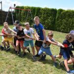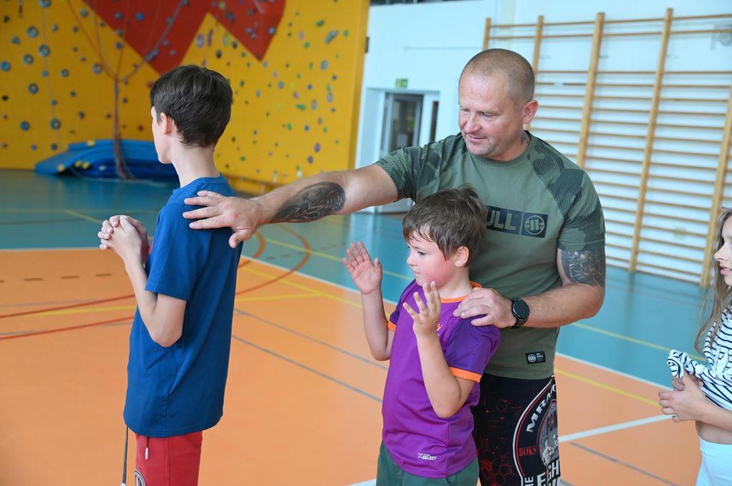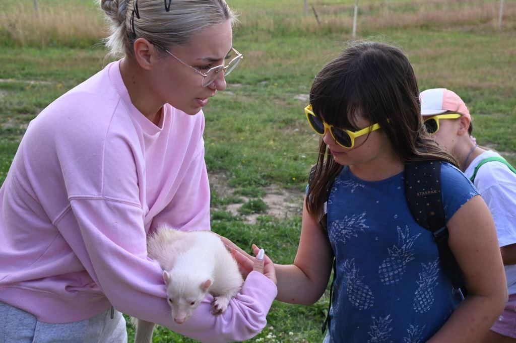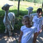 We wtorek postanowiliśmy odwiedzić Park Wodny Wilkasy. Uczestnicy pluskali się w basenie, grali w piłkę wodną, a jedna z dziewczynek zrobiła furorę, pływając w pięknym stroju złotej rybki. Po godzinie wodnych atrakcji przeszliśmy na salę gimnastyczną. Tam czekał już na nas właściciel Fight Club Mrągowo Tomasz Bieńkowski. Przez półtorej godziny dzieci ćwiczyły pod jego okiem w formule kickboxing skacząc, robiąc pompki, poznając podstawy boksowania i uderzania z wyskoku. Miłe wspomnienia podopieczni mają również z dwugodzinnej wizyty w gościńcu Bocianowo koło Węgorzewa, gdzie od 11 lat prowadzona jest profesjonalna hodowla alpak „Slow Life Alpacas”, a stado liczy prawie  80 zwierząt. Uczestnicy zajęć mieli wyjątkową możliwość obcowania z alpakami w ogrodzie, wizyty w głównej alpakarni oraz spotkania z pozostałą częścią stada na pastwiskach. Najbardziej jednak podobał się im spacer z alpakami o wdzięcznych imionach Dolissima, Aurora, Rozalka czy Amaretto. Trafiliśmy także na narodziny alpaki, oglądając malutką i jeszcze nieporadną w towarzystwie mamy. Serdecznie dziękujemy za świetne przyjęcie właścicielce pani Kornelii i poczęstowanie naszej grupy ekologicznymi ciasteczkami i schłodzoną herbatą z mięty, jabłuszek i syropu z czarnego bzu.