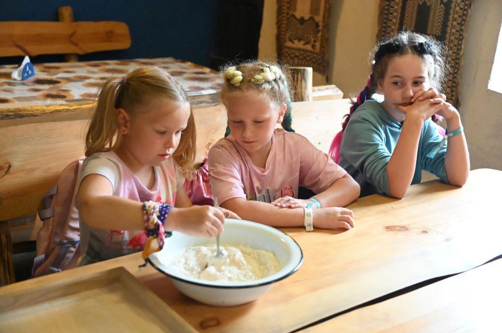 Czas spędziliśmy też w Wiosce Surfów nad jeziorem Niegocin, gdzie pod okiem kilku instruktorów dzieci pobierały naukę zasad korzystania z desek surfingowych, najpierw na trawie, później zaś na wodzie. Próbowały utrzymywać się na desce SUP stojąc, brały do ręki pagaje, wiosłując parami i przemieszczając się w pobliżu brzegu. Czwartek to warsztaty chlebowe w Muzeum Indian w Spytkowie. W klimatycznym wnętrzu Chlebowego Domku uczestnicy wyrabiali ciasto drożdżowe oraz formułowali i piekli smaczne bułeczki. W oczekiwaniu na wyrastanie ciasta z ust szefowej pani Karoliny usłyszeli, skąd bierze się mąka na chleb, na czym polega praca rolnika, młynarza i piekarza, obejrzeli bogatą wystawę zabytkowych sprzętów. Podczas warsztatów można było także nakarmić zwierzęta własnoręcznie zmielonym ziarnem przy użyciu maszynki do mielenia, żarna czy kamieni. A na zakończenie zajęć wyjęte z pieca jeszcze gorące bułki dzieciaki spożywały z miodem, marmoladą, masełkiem i twarożkiem.