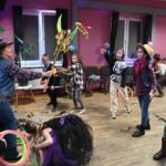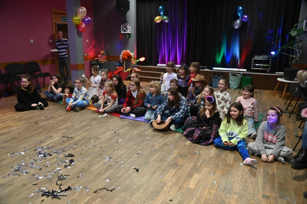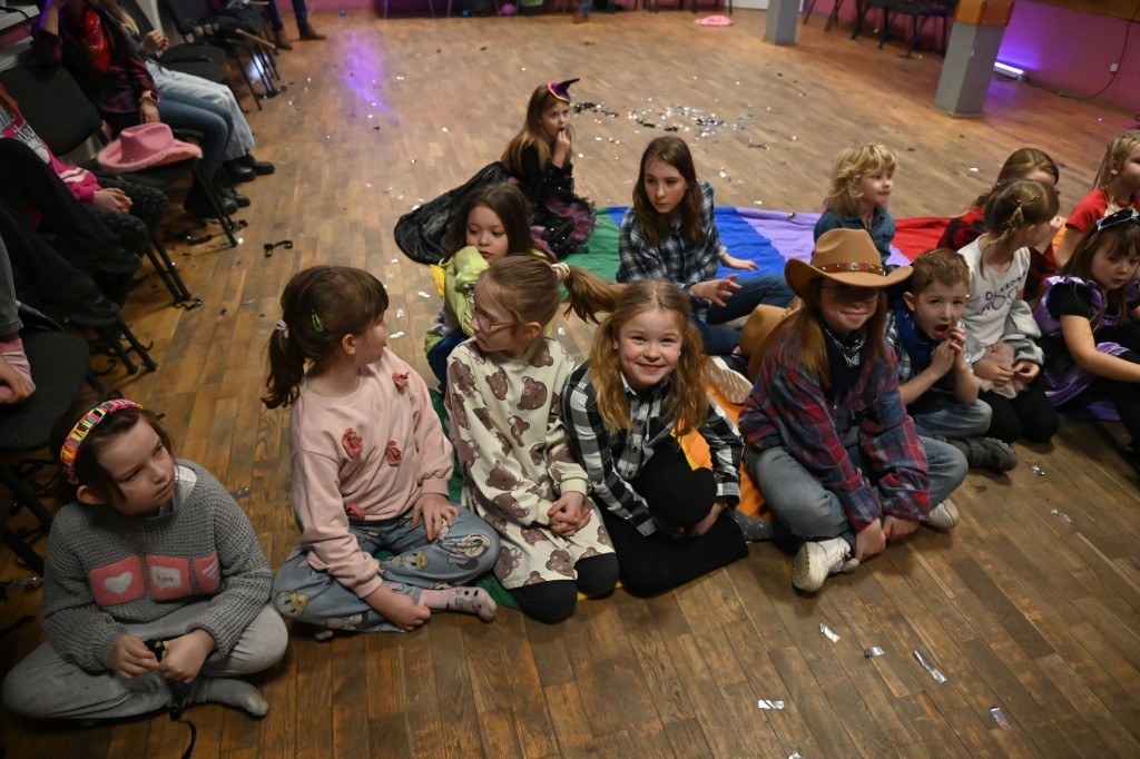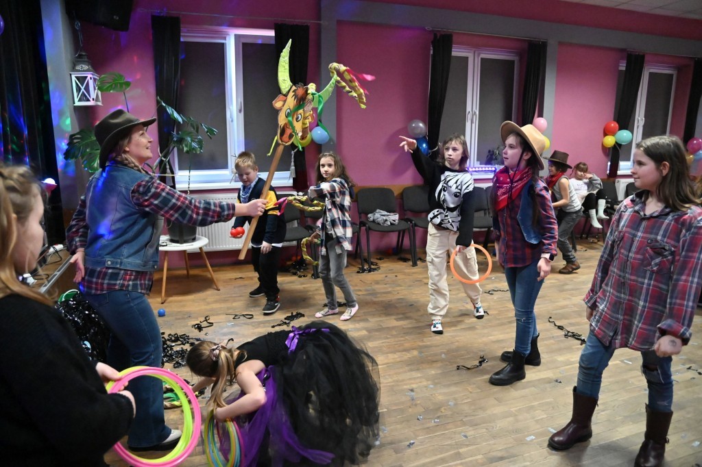 A na deser wybraliśmy się w gości do zaprzyjaźnionego Ośrodka Kultury w Miłkach, gdzie w towarzystwie miejscowych dzieci i młodzieży podsumowaliśmy ferie na balu karnawałowym prowadzonym w konwencji rodem z Dzikiego Zachodu. Ale uczestnicy przywdziali nie tylko kowbojskie stroje, byli również Pippi Langstrumpf z warkoczykami na drutach, Harry Potter, Spider-Man, Batman czy filmowa księżniczka. Uczestnicy korzystali z chusty animacyjnej, rzucali kółkami na paliki, próbowali z odległości rzucać lassem do celu i przechodzili pod liną. W przerwie posilali się zapiekankami, a na pamiątkę udziału w dwutygodniowych zajęciach otrzymali piękne, szklane kule.