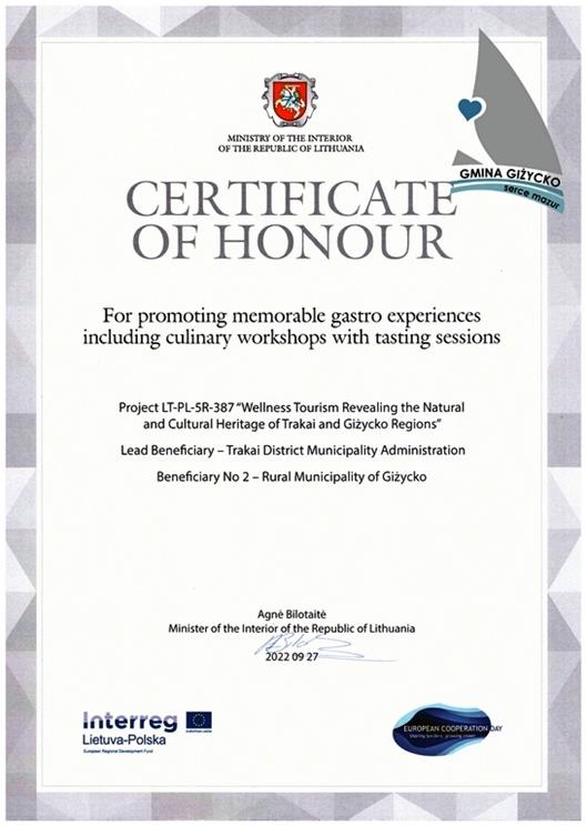 Z przyjemnością informujemy, że projekt Gminy Giżycko realizowany wspólnie z partnerem litewskim – Administracją Samorządu Rejonu Trockiego nr LT-PL-5R-387 pn. „Turystyka zdrowotna ujawniająca naturalne i kulturowe dziedzictwo regionów trockiego i giżyckiego” otrzymał nominację dla najbardziej wyjątkowych projektów Programu Interreg V-A Litwa – Polska w obecnej perspektywie finansowej.