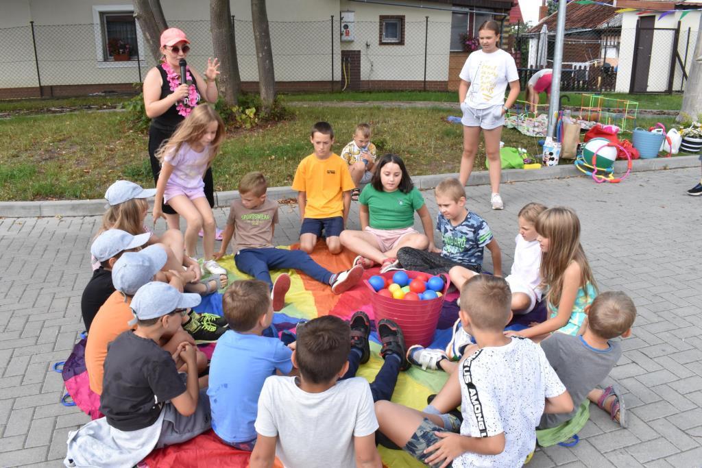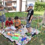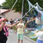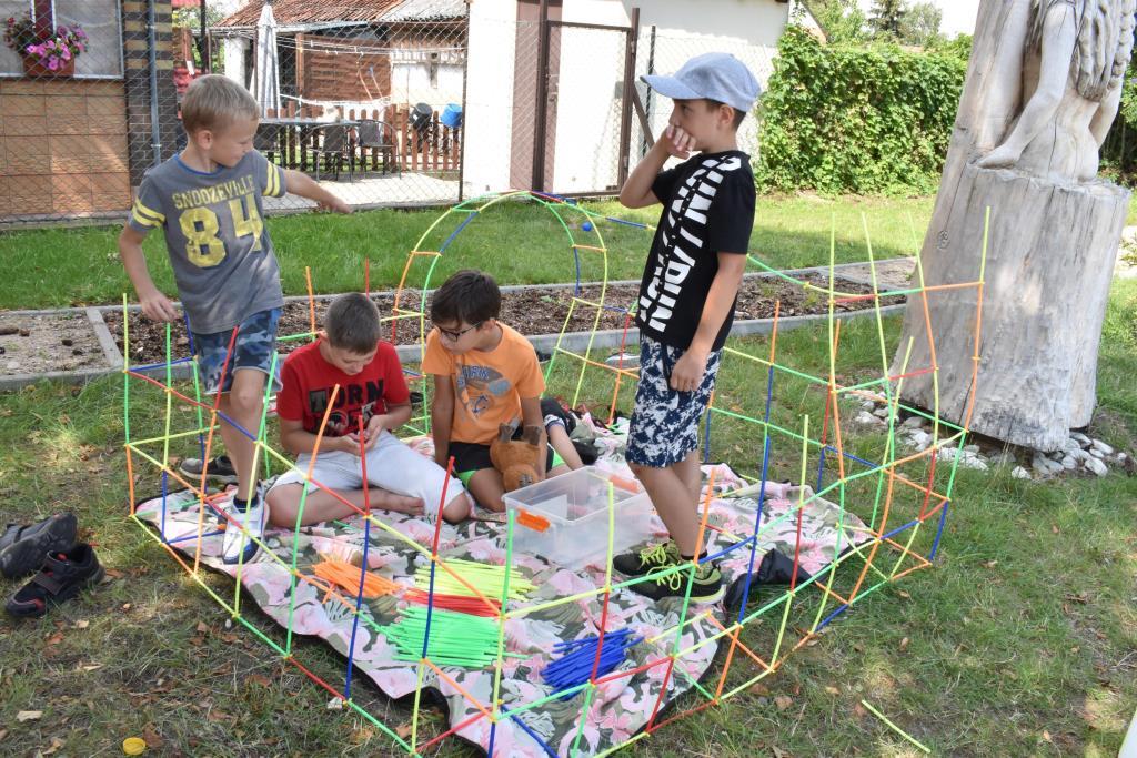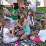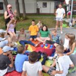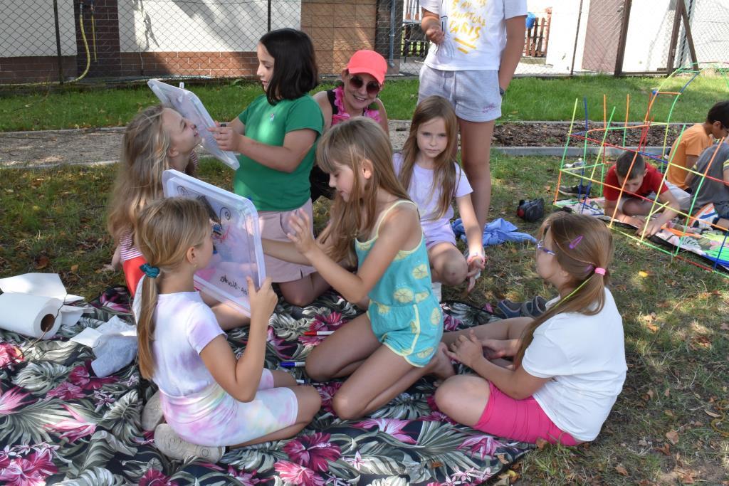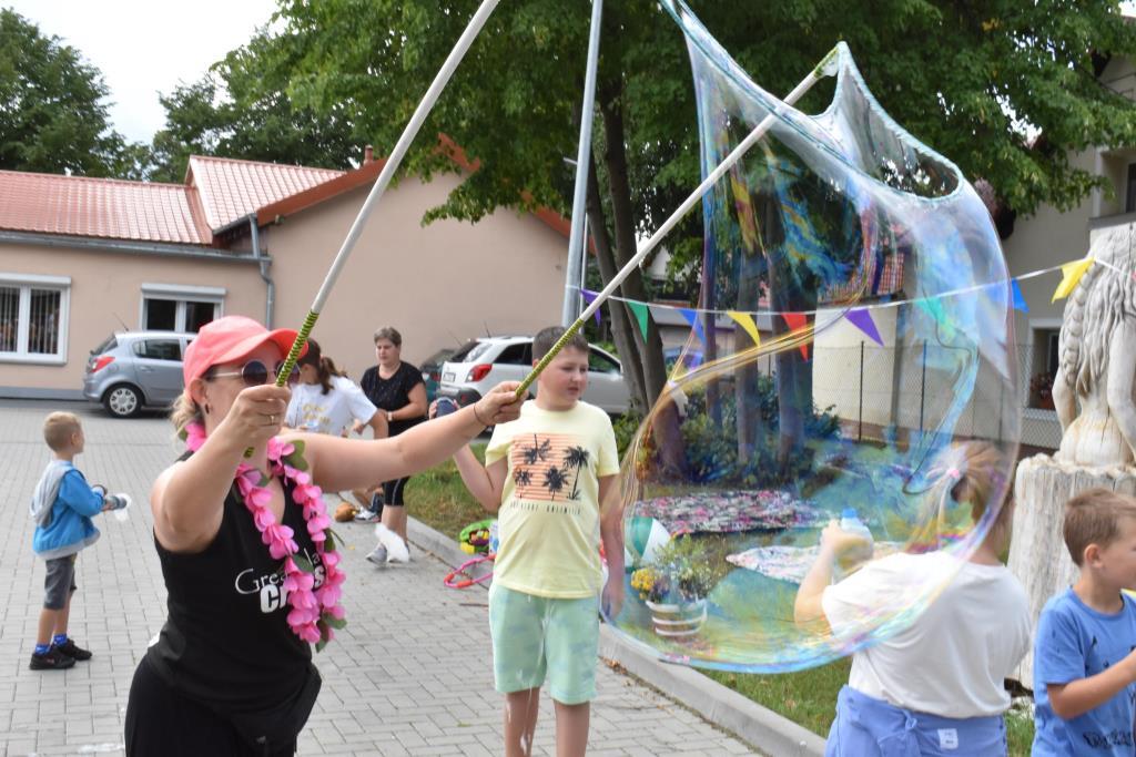 Na zakończenie wspaniałych dwóch tygodni nasza grupa miała zajęcia z animatorką Edytką z Miłek na skwerze rekreacyjnym ośrodka. Każdy z podopiecznych przygotował dmuchacz baniek na bazie skarpetek oraz buteleczek PET, potem wykorzystując go do wydmuchiwania jak najdłuższych bańkowych tworów. Dzieci rzucały piłeczkami do celu, na lustereczkach odwzorowywały twarze koleżanek i kolegów, budowały przestrzenne konstrukcje z patyczków, robiły wspaniałe wianki. Każdy z uczestników dostał na pamiątkę udziału w zajęciach wakacyjnych okolicznościową czapeczkę oraz figurkę.