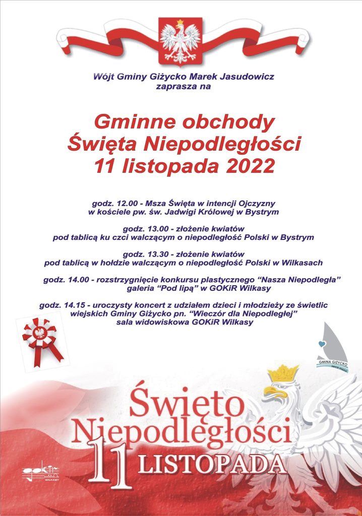 O godzinie 14:00 zaplanowano zaś część artystyczną w Gminnym Ośrodku Kultury i Rekreacji w Wilkasach, gdzie zostaną ogłoszone wyniki konkursu plastycznego „Nasza Niepodległa”, odbędzie się też uroczysty koncert „Wieczór dla Niepodległej”, w którym ze swoim repertuarem wystąpią dzieci i młodzież ze świetlic wiejskich gminy Giżycko.