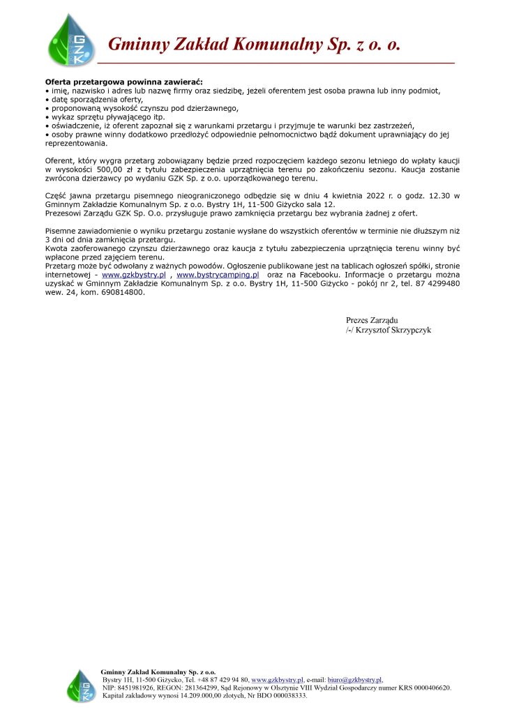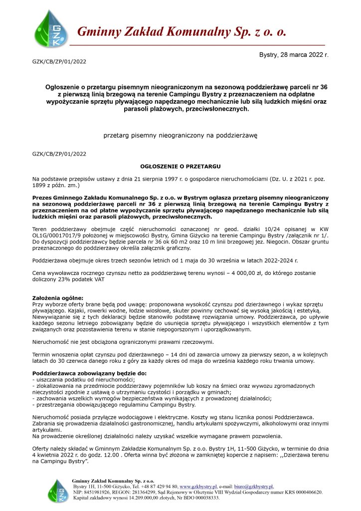 Gminny Zakład Komunalny Sp. z o.o. ogłasza przetarg pisemny nieograniczony na poddzierżawę 28 marca 20220