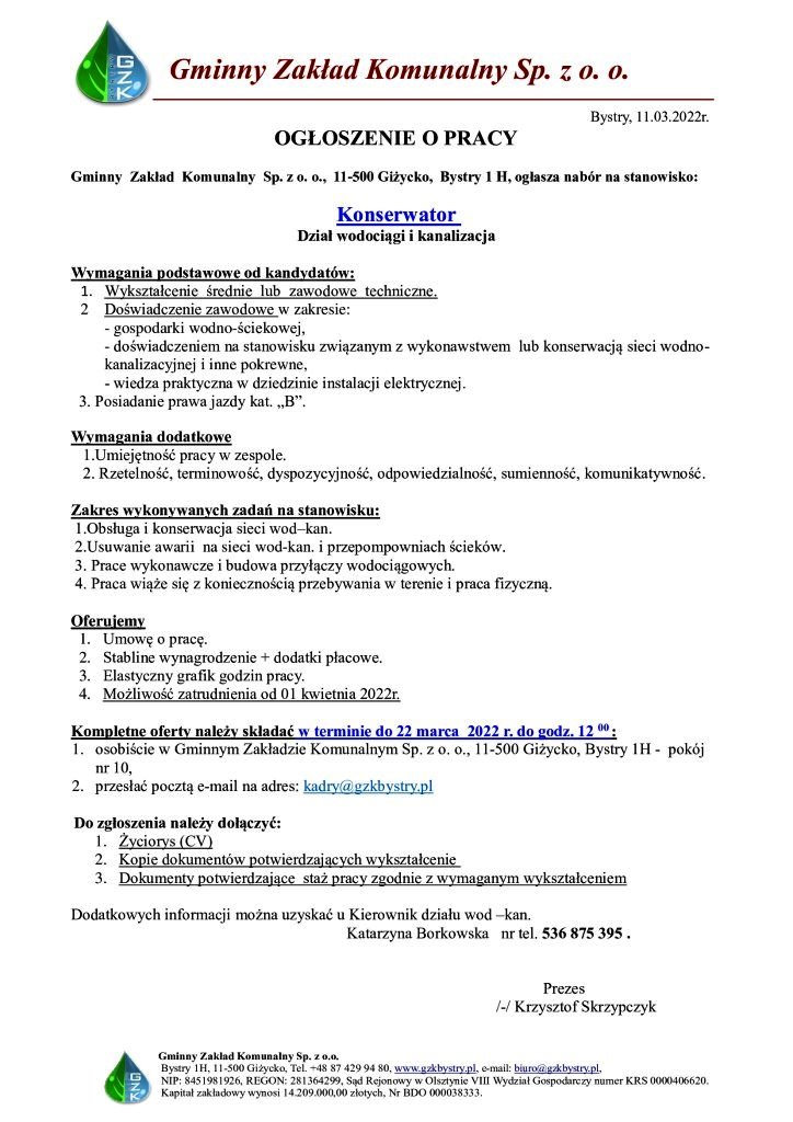 Gminny Zakład Komunalny w Bystrym ogłasza nabór na stanowisko konserwatora 11 marca 20220Gminny Zakład Komunalny Sp. z o.o. w Bystrym ogłasza nabór na stanowisko: Konserwator. Dział wodociągi i kanalizacja.