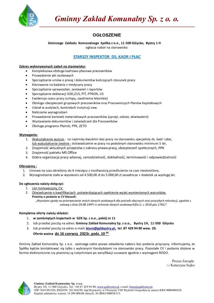 Gminny Zakład Komunalny w Bystrym ogłasza nabór na stanowisko Starszy Inspektor ds. Kadr i Płac 7 czerwca 20230Gminny Zakład Komunalny Sp. z o.o., 11-500 Giżycko, Bystry 1 H ogłasza nabór na stanowisko Starszy Inspektor ds. Kadr i Płac. Szczegóły ogłoszenia poniżej na grafice.