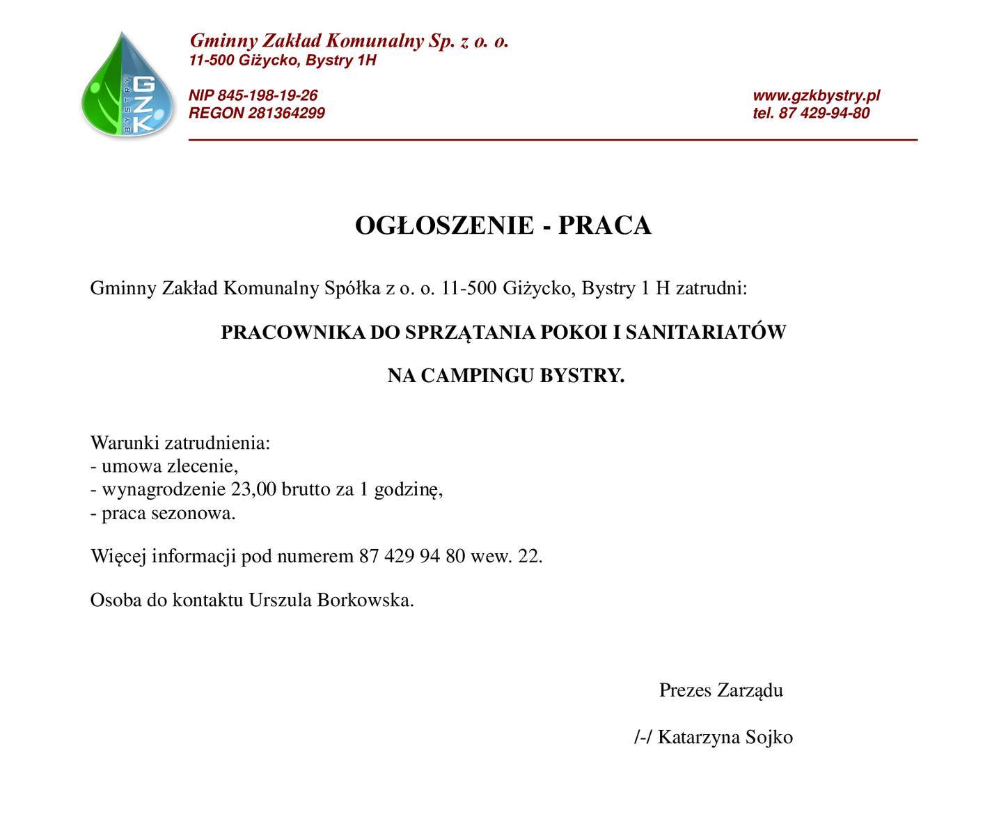 Gminny Zakład Komunalny w Bystrym zatrudni pracownika do sprzątania pokoi i sanitariatów 13 kwietnia 20230Gminny Zakład Komunalny Sp. z o.o., 11-500 Giżycko, Bystry 1 H zatrudni pracownika do sprzątania pokoi i sanitariatów na Campingu Bystry.Szczegóły ogłoszenia poniżej na grafice.
