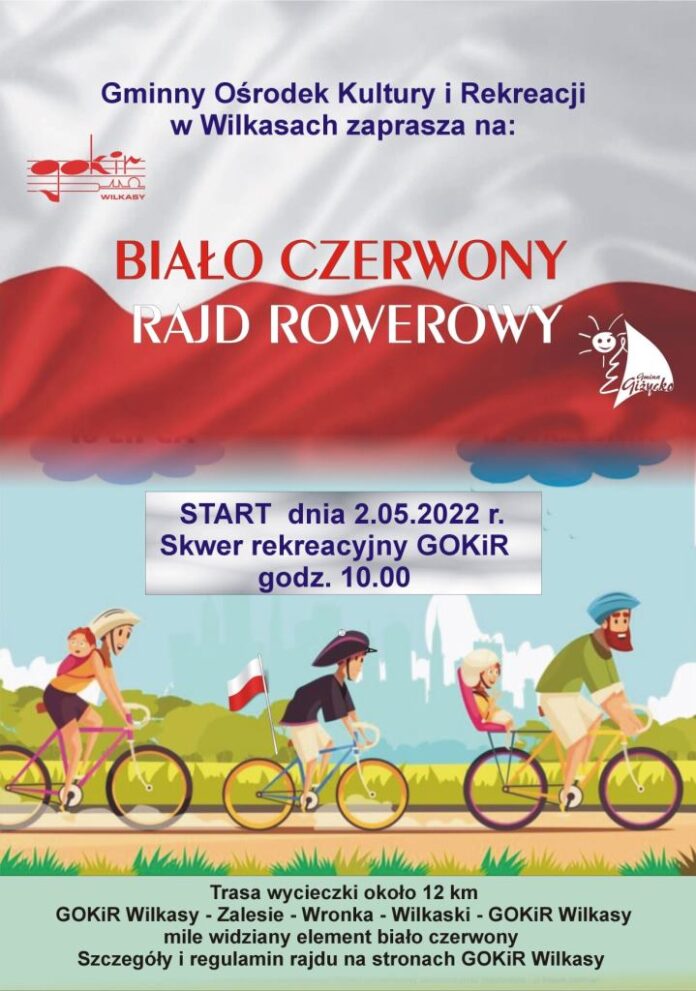 Gminny Ośrodek Kultury i Rekreacji w Wilkasach, z okazji Święta Flagi, serdecznie zaprasza do zapisów na Biało-Czerwony Rajd Rowerowy.