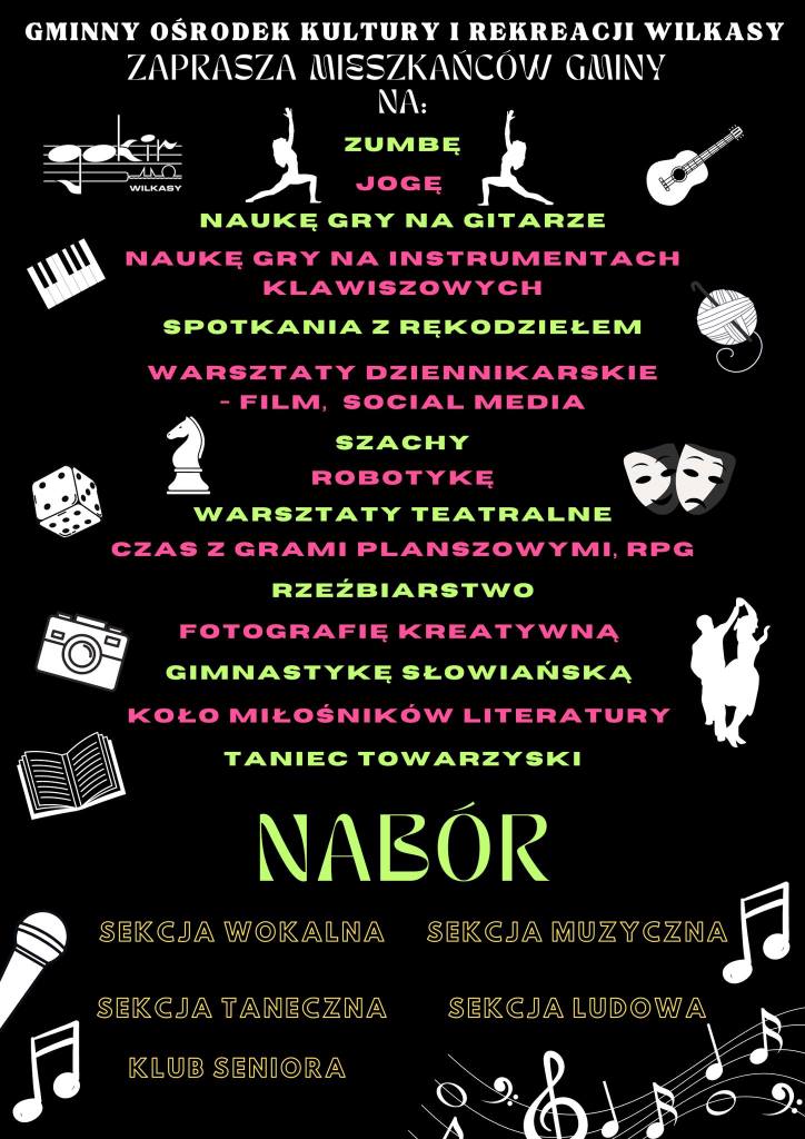 Gminny Ośrodek Kultury i Rekreacji w Wilkasach zaprasza na zajęcia mieszkańców Gminy Giżycko. Do wyboru jest m.in. zumba, joga, nauka gry na gitarze, robotyka, fotografia kreatywna i wiele innych. Szczegóły na plakacie poniżej.