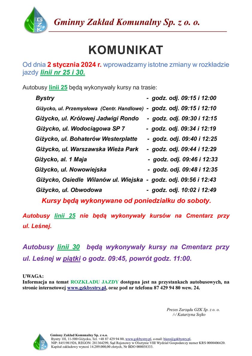 GZK w Bystrym informuje: zmiany w rozkładzie jazdy linii nr 25 i 30 od 2 stycznia 2024 r. 27 grudnia 20230Gminny Zakład Komunalny w Bystrym informuje, że od dnia 2 stycznia 2024 r. wprowadza istotne zmiany w rozkładzie jazdy linii nr 25 i 30.Szczegóły poniżej na grafice.