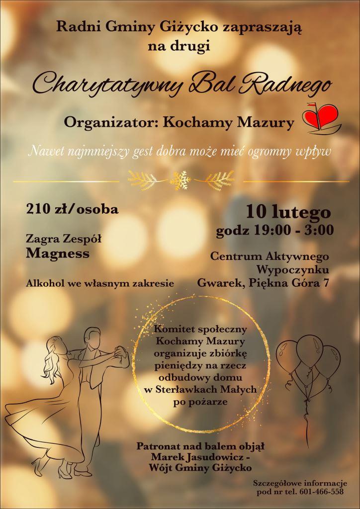 Komitet społeczny „Kochamy Mazury” zaprasza na II Charytatywny Bal Radnego, podczas którego będzie prowadzona zbiórka publiczna na odbudowę domu po pożarze w Sterławkach Małych.
