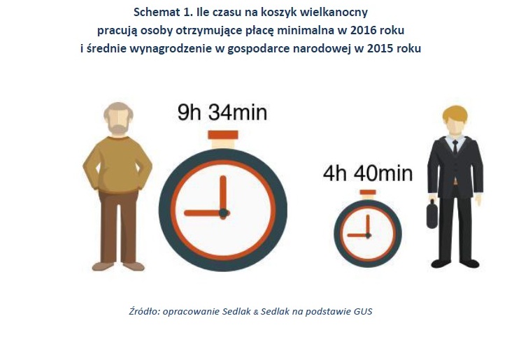 Aby zarobić na świąteczny koszyczek ludzie otrzymujący przeciętne wynagrodzenie będą pracować o 4h 54min krócej od osób z wynagrodzeniem minimalnym. Zakładając, że osoby te pracują 8h dziennie, pracownik z minimalnym wynagrodzeniem otrzymywanym w Polsce w 2016 roku będzie musiał pracować ponad jeden dzień, aby zapełnić świąteczny koszyczek.