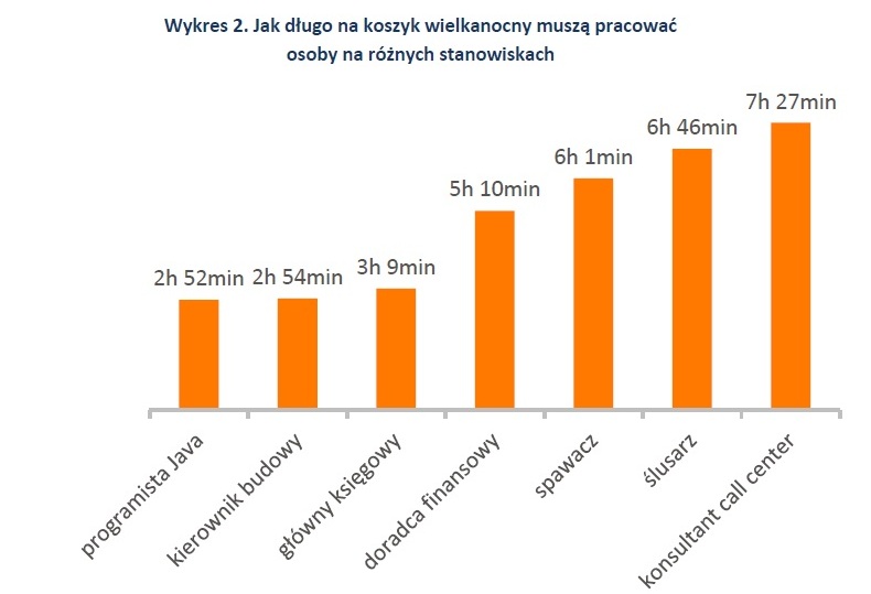 Na poniższym wykresie pokazaliśmy, ile czasu na koszyk wielkanocny muszą pracować osoby zatrudnione na różnych stanowiskach. Najlepiej wypada programista Java i kierownik budowy, którzy na zapełnienie koszyczka wielkanocnego potrzebują niespełna 3h pracy. Ponad dwa razy więcej niż osoby na wcześniej wspomnianych stanowiskach będą musieli pracować spawacz i ślusarz. Najwięcej czasu w pracy ze wszystkich wymienionych stanowisk będzie musiał spędzić konsultant call center. Osobie zatrudnionej na tym stanowisku praca na koszyczek zajmie prawie cały dzień roboczy.