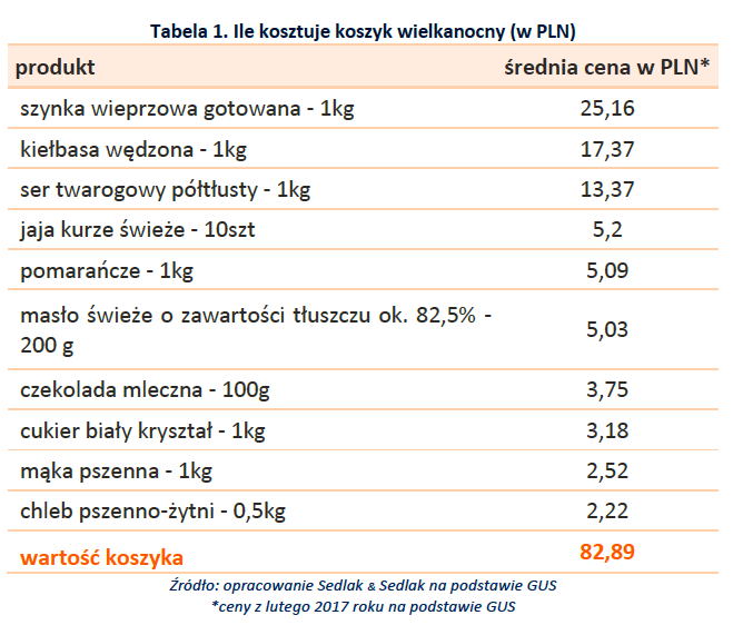 Na potrzeby artykułu sprawdziliśmy, ile czasu na koszyczek wielkanocny musi pracować osoba pracująca w Polsce, która otrzymuje wynagrodzenie minimalne – 2 000 PLN brutto (1 459 PLN netto) i przeciętne wynagrodzenie w gospodarce narodowej. Według danych GUS przeciętne wynagrodzenie brutto w sektorze przedsiębiorstw w lutym 2017 roku wynosiło – 4 047 PLN brutto (2 885,86 PLN netto). Aby zarobić na świąteczny koszyczek ludzie otrzymujący przeciętne wynagrodzenie będą pracować o 4 h 44 min krócej od osób z wynagrodzeniem minimalnym. Zakładając, że osoby te pracują 8 h dziennie, pracownik z minimalnym wynagrodzeniem otrzymywanym w Polsce w 2017 roku będzie musiał pracować