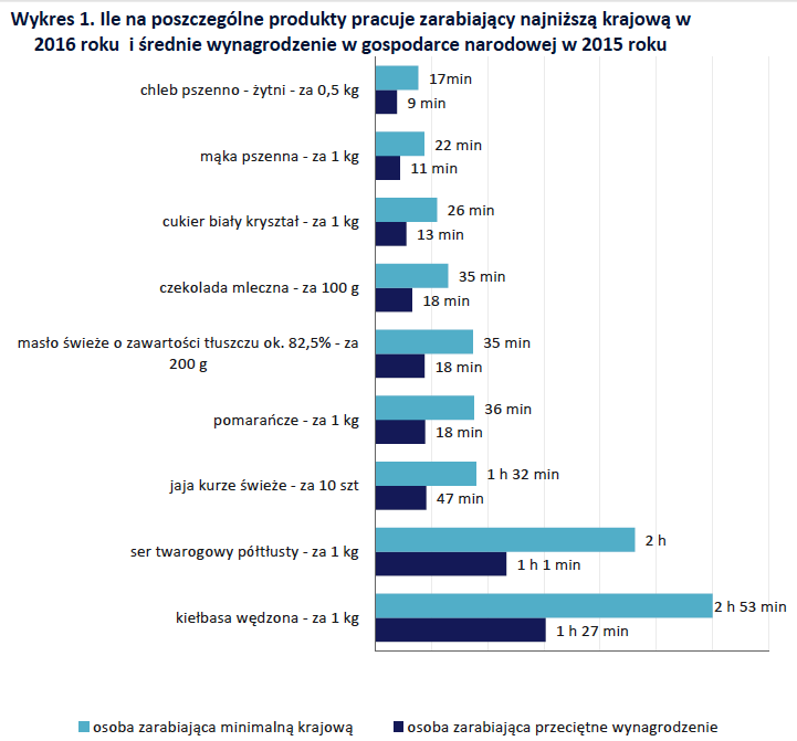 Stworzyliśmy także zestawienie przedstawiające, ile czasu zajmie nam praca na poszczególne dobra, których nie może zabraknąć w koszyku. Jak pokazuje wykres,