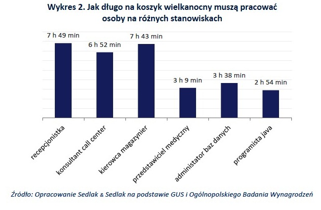 Na poniższym wykresie pokazaliśmy, ile czasu na koszyk wielkanocny muszą pracować osoby zatrudnione na różnych stanowiskach. Najlepiej wypada programista Java i przedstawiciel medyczny, którzy na zapełnienie koszyczka wielkanocnego potrzebują niespełna trzech godzin pracy. Ponad dwa razy więcej niż osoby na wcześniej wspomnianych stanowiskach będą musieli pracować konsultanci call center i kierowcy magazynierzy. Najwięcej czasu w pracy ze wszystkich wymienionych stanowisk będzie musiał spędzić recepcjonista. Osobie zatrudnionej na tym stanowisku praca na koszyczek zajmie prawie cały dzień roboczy.