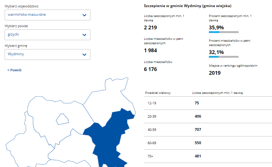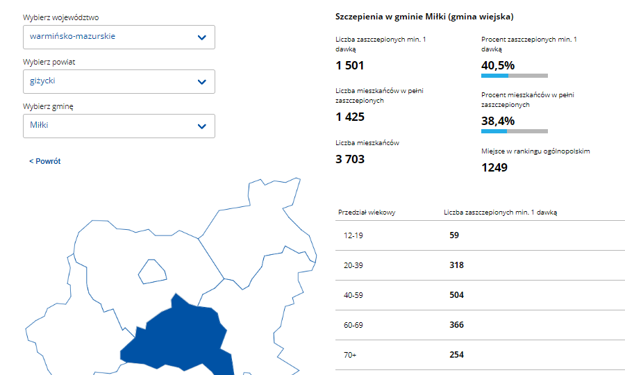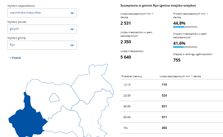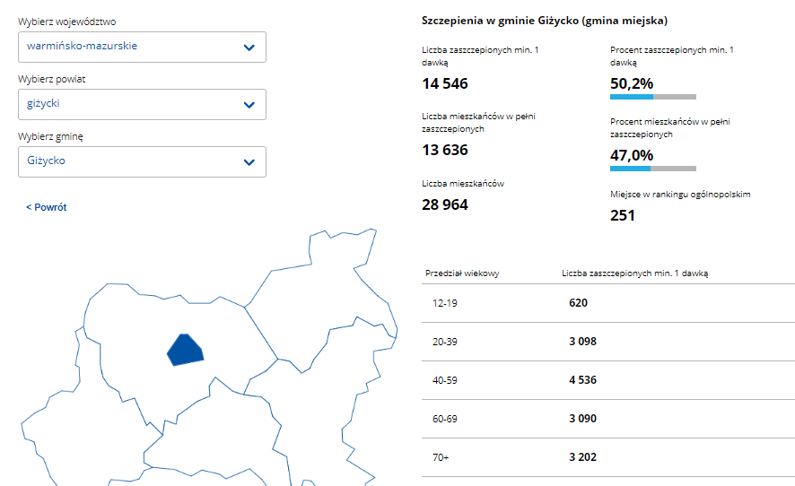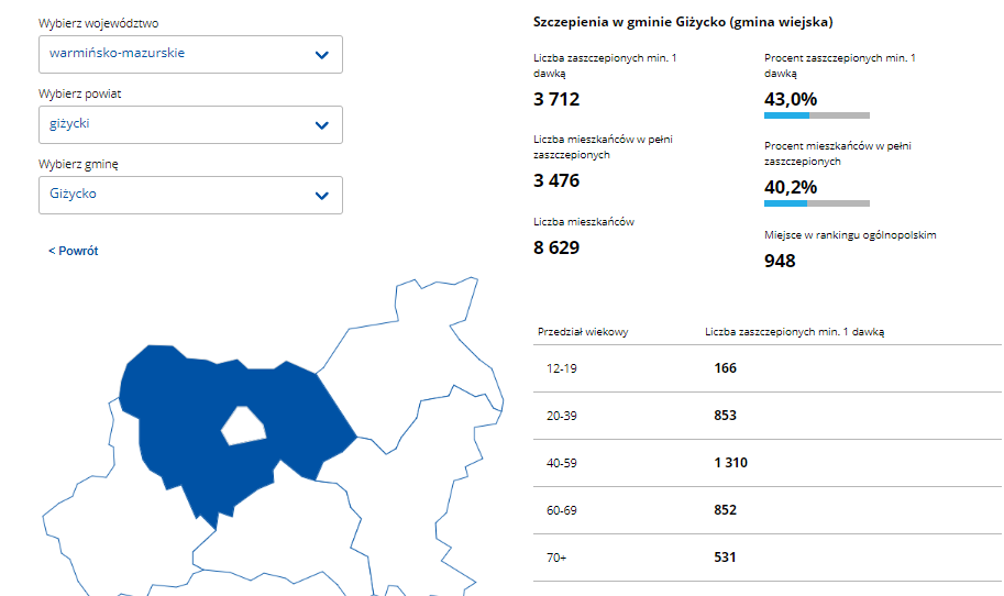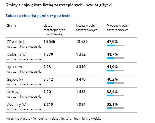 Poniżej prezentujemy poziom zaszczepienia w poszczególnych gminach powiatu giżyckiego.
