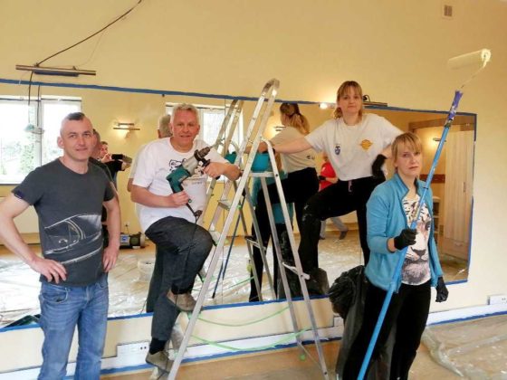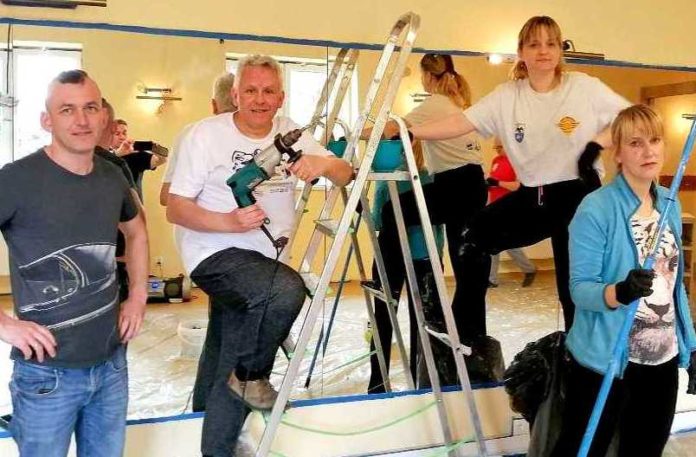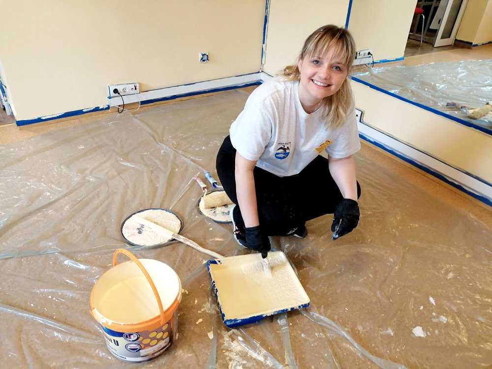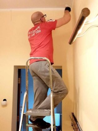 Wyłożyli podłogi folią malarską, przygotowali szpachelki, skrobaki, kuwety, wiaderka, wałki i pędzle, a po zaklejeniu rogów sufitu, ścian i podłogi taśmą papierową ruszyli do boju jakby byli profesjonalną ekipą, oczywiście z zachowaniem odpowiednich środków bezpieczeństwa i odległości od siebie. Aby przejść do malowania musieli wpierw uzupełnić ubytki i wyrównać powierzchnie. Zrobione już galeria sztuki, sala lustrzana, pomieszczenie kuchenne i korytarz lśnią teraz jak nowe, aż zachęcają do korzystania z nich.