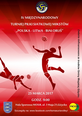 Już 25 marca 2017 r. odbędzie się czwarta edycja Międzynarodowego Turnieju Piłki Siatkowej Mikstów „Polska-Litwa-Białoruś” organizowanego przez Stowarzyszenie „Klub Sportowy Masuria Volley” przy współudziale MOSiR w Giżycku oraz dofinansowaniu gminy Miejskiej Giżycko.