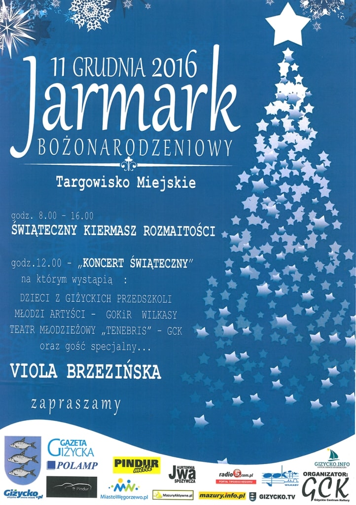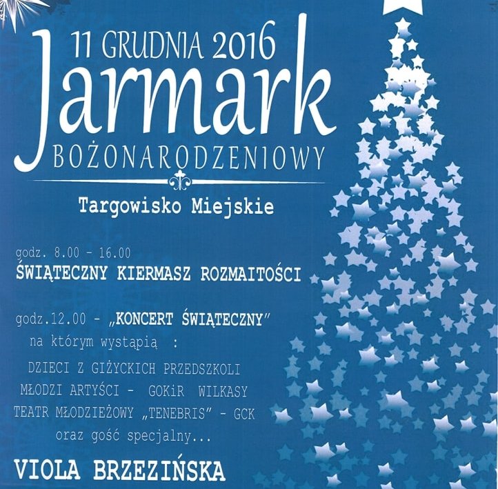 A o godz.12.00 rozpocznie się „Koncert Świąteczny”, na którym wystąpią dzieci z giżyckich przedszkoli, wokalistki z Gminnego Ośrodka Kultury i Rekreacji w Wilkasach, Teatr Młodzieżowy TENEBRIS ( Giżyckie Centrum Kultury) oraz gość specjalny – VIOLA BRZEZIŃSKA , laureatka „Szansy na sukces”(1995), zwyciężczyni konkursu „Debiutów” na Krajowym Festiwalu Polskiej Piosenki w Opolu (1995),wszechstronna wokalistka, mająca w swoim dorobku kilkanaście płyt, w tym albumy solowe.