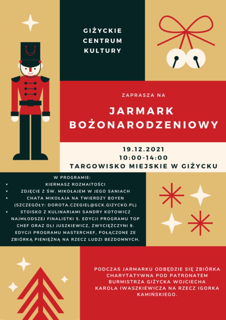 19 grudnia w godzinach 10:00-14:00 na Targowisku Miejskim w Giżycku odbędzie się Jarmark Bożonarodzeniowy.