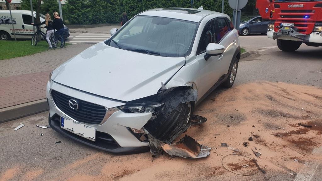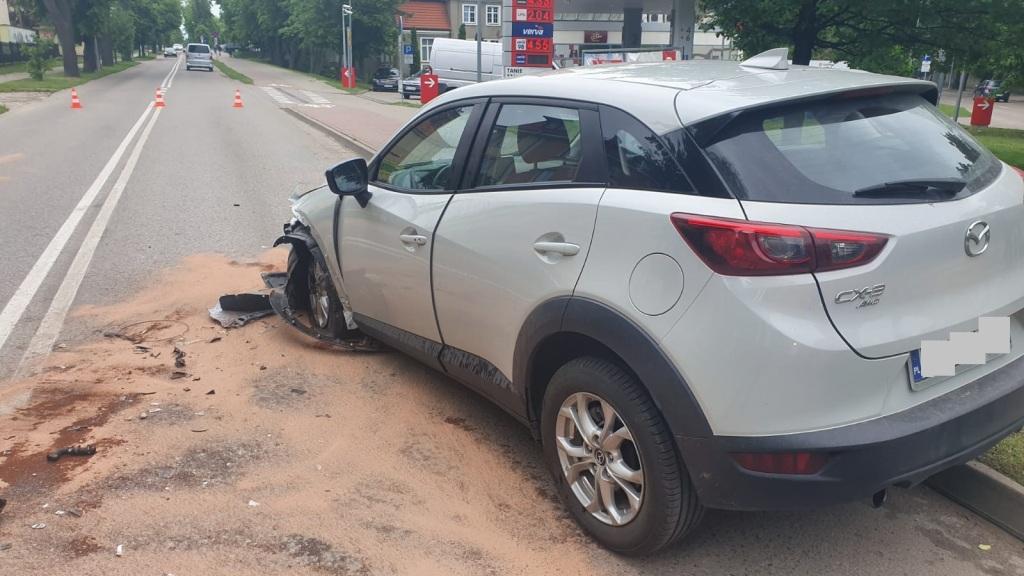 Kolejne zdarzenie, również groźnie wyglądające miało miejsce około godziny 13:00 na ulicy 1-go Maja. Tam kierowca auta Kia, wyjeżdżający ze stacji paliw, nie ustąpił pierwszeństwa przejazdu prawidłowo jadące Audi, a wytrącone z ruchu Audi uderzyło w jadącą z naprzeciwka Mazdę. W zdarzeniu udział brało 4 uczestników. Jednym z pojazdów jechała kobieta z dzieckiem. Na szczęście nikomu nic się nie stało. Kierowcy byli trzeźwi. Sprawca otrzymał mandat karny, a na jego konto trafiły również punkty karne.