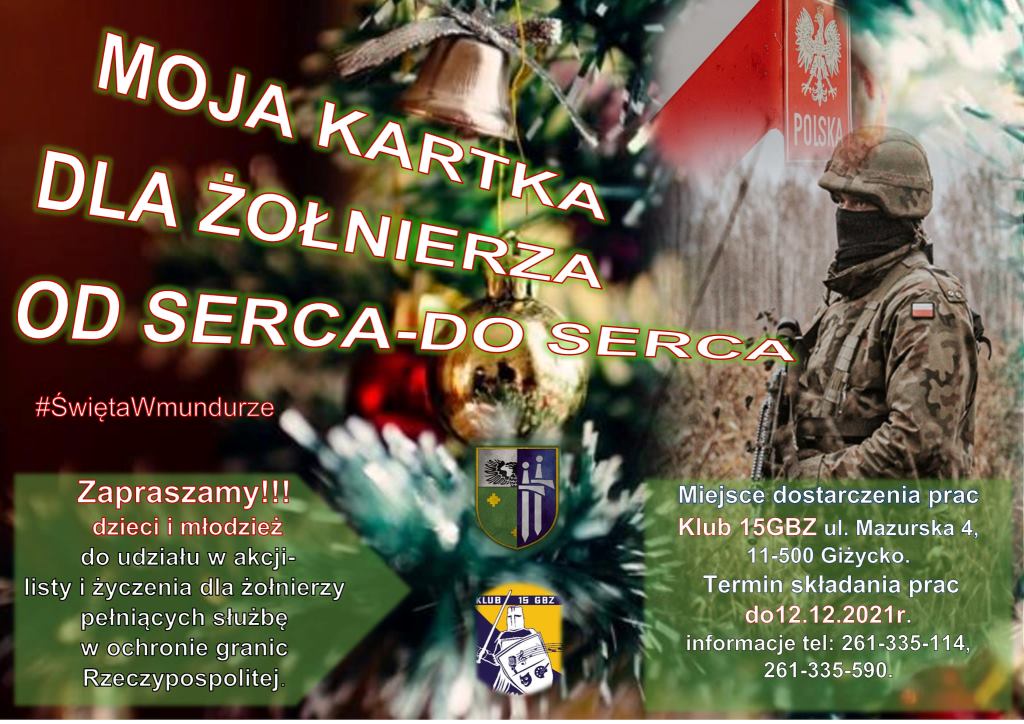 – Zapraszamy wszystkie dzieci i młodzież do udziału w akcji tworzenia kartek i życzeń świątecznych (listów) do żołnierzy pełniących służbę w ochronie granic Rzeczypospolitej. Wielu z nich spędzi Święta z dala od swoich bliskich. Bądźmy z Nimi w tym trudnym czasie – czytamy na facebookowym profilu Klubu 15 Giżyckiej Brygady Zmechanizowanej