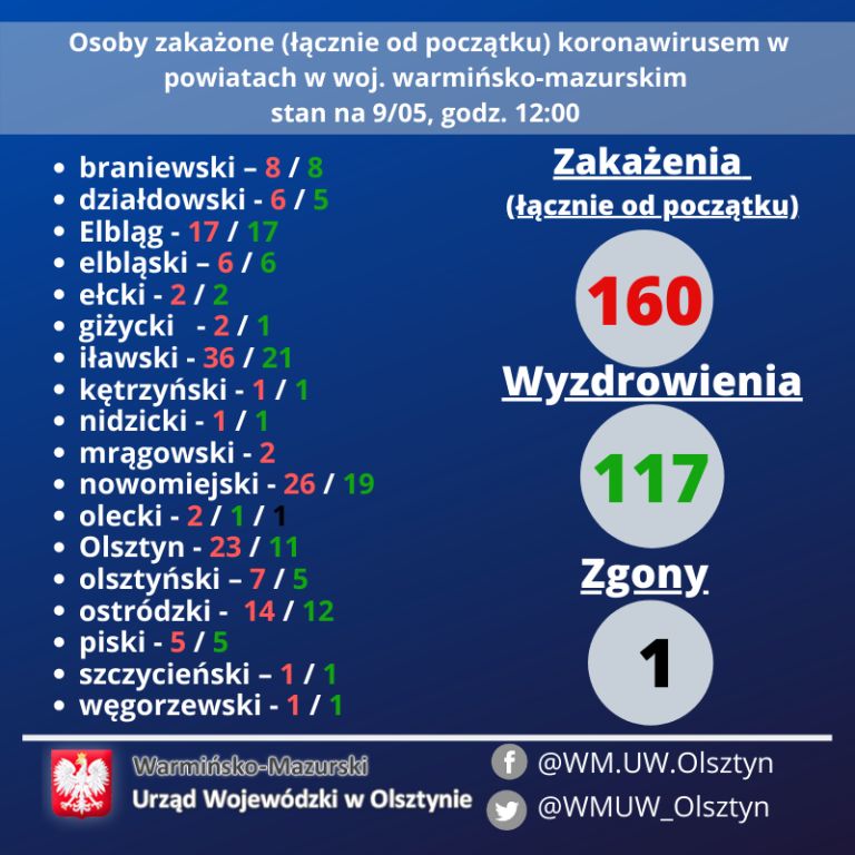 Łącznie w województwie warmińsko mazurskim zachorowało 160 osób, wyzdrowiało 117.