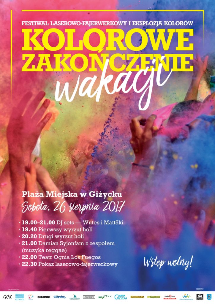 W sobotę, 26 sierpnia na plaży miejskiej odbędzie się kolorowy zawrót głowy, czyli Festiwal Laserowo Fajerwerkowy i Eksplozja Kolorów. Wszystko to połączone z występem dwóch wysmienitych DJów – Matt5kiego oraz WUTESa. Na deser zagra również gwiazda muzyki reggea – Damian Syjonfam, a na zakończenie wieczoru Teatr Ognia Los Fuegos!