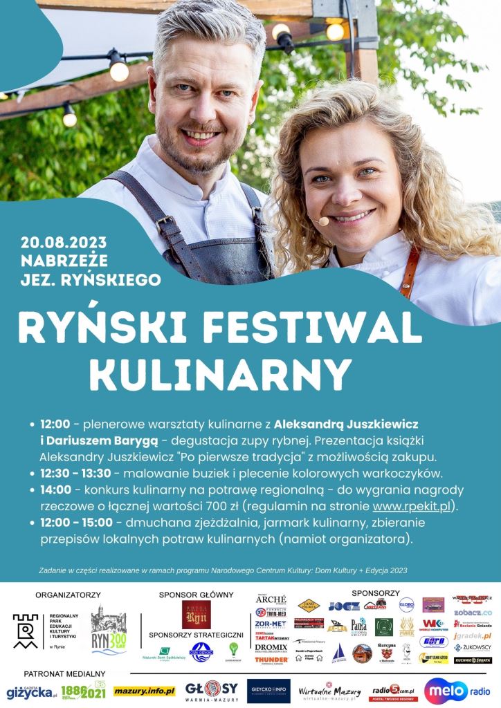 W niedzielę na nabrzeżu Jeziora Ryńskiego odbędzie się Ryński Festiwal Kulinarny, w programie m.in. plenerowe warsztaty kulinarne z Aleksandrą Juszkiewicz i Dariuszem Barygą oraz konkurs kulinarny na potrawę regionalną.
