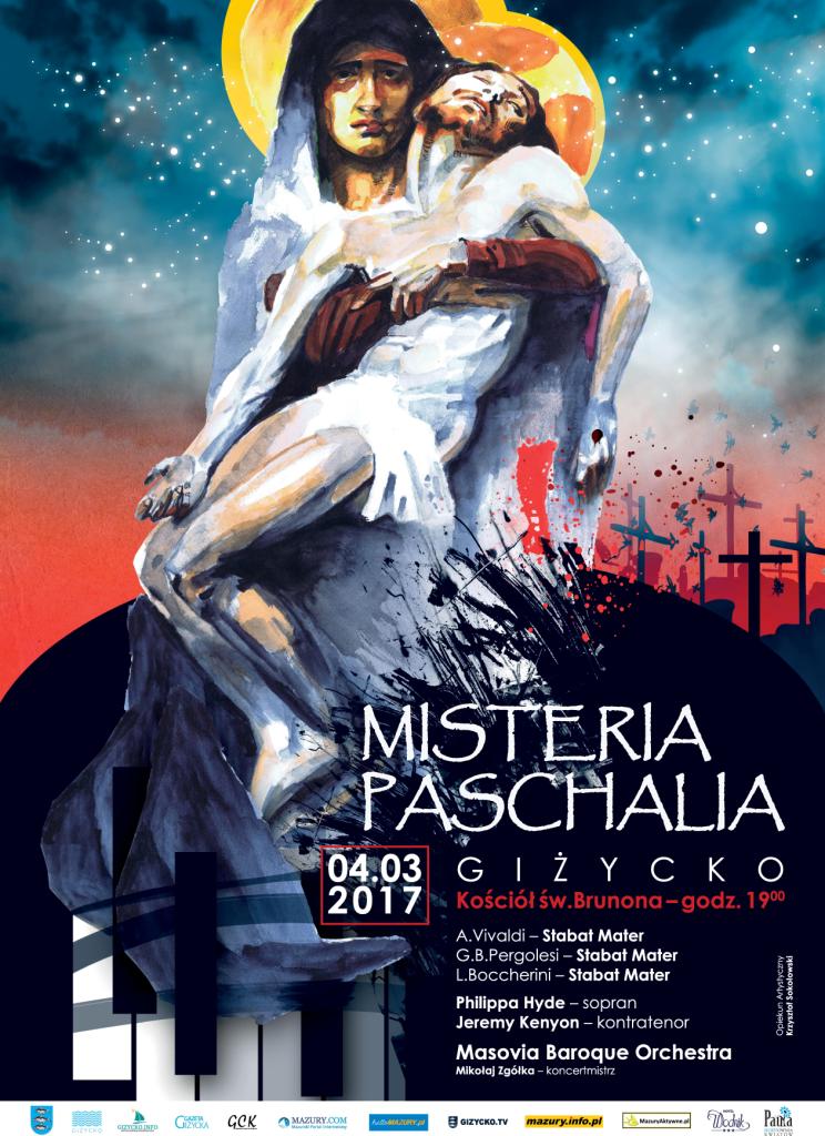 Wyjątkowy jest również sam plakat „Misteria Paschalia”, stworzony specjalnie dla Giżycka przez wybitnego artystę Grzegorza Chorążka. Urodzony w 1979 roku, rysownik, ilustrator, designer, absolwent Akademii im. Jana Długosza w Częstochowie wydział Sztuki w pracowni grafiki prof. Ewy Zawadzkiej, zajmuje się obecnie grafiką komputerową, projektowaniem graficznym, malarstwem sztalugowym. Dzieła tego samego autora towarzyszyły również ubiegłorocznym edycjom Giżyckiego Lata z Haendlem oraz Giżycko Baroque Festival.