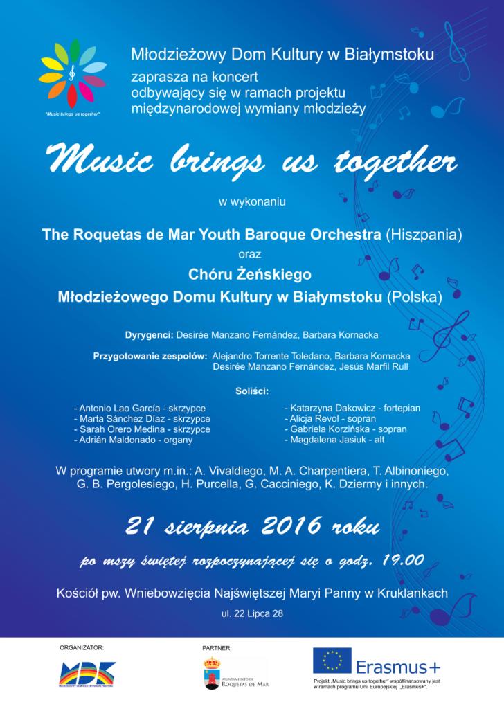 Młodzieżowy Dom Kultury w Białymstoku zaprasza na koncert odbywający się w ramach projektu międzynarodowej wymiany młodzieży „Music brings us together” realizowanego z programu Unii Europejskiej Erasmus+.