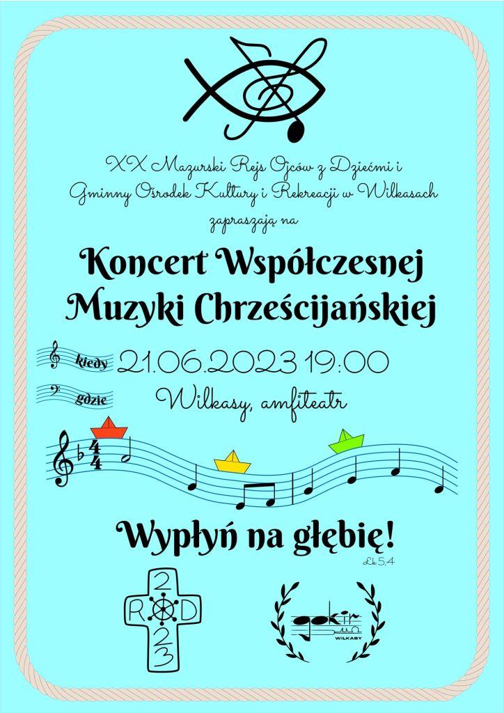 Ojcowie z dziećmi – uczestnicy tegorocznego Rejsu Ojców z Dziećmi – wspólnie z GOKiR w Wilkasach serdecznie zapraszają na Koncert Współczesnej Muzyki Chrześcijańskiej, który odbędzie się w środę 21 czerwca o godz. 19:00.