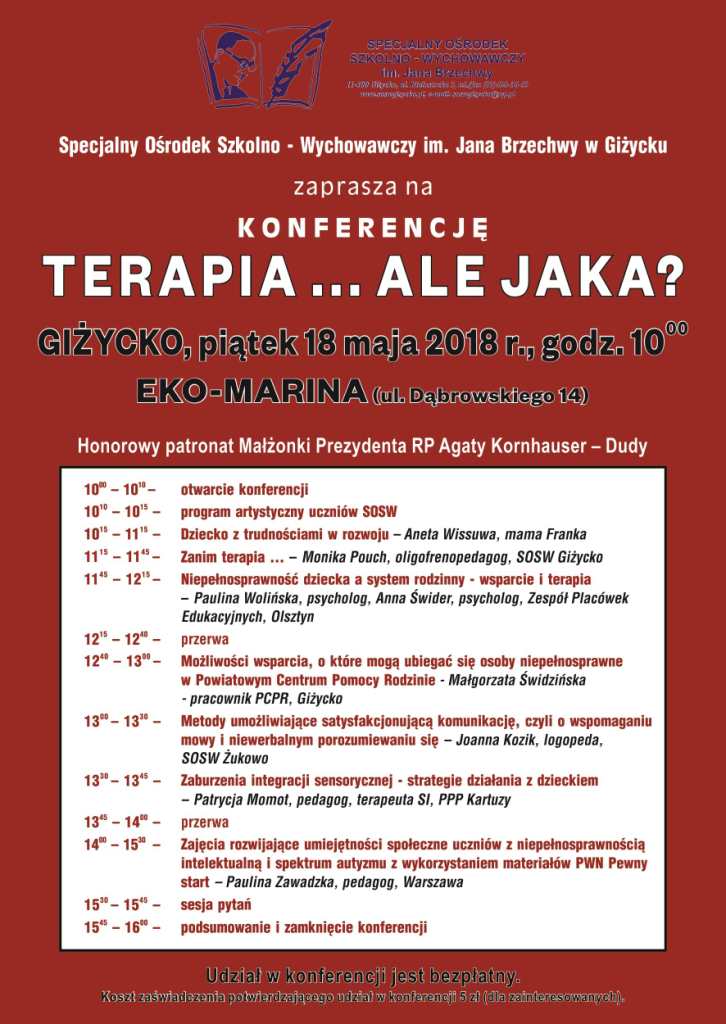 Specjalny Ośrodek Szkolno-Wychowawczy im. J. Brzechwy w Giżycku zaprasza do udziału w konferencji „Terapia… Ale jaka?”, która odbędzie się 18 maja 2018 roku, godz. 1000 – 1600, w budynku giżyckiej EKO-MARINY (ul. Dąbrowskiego 14).