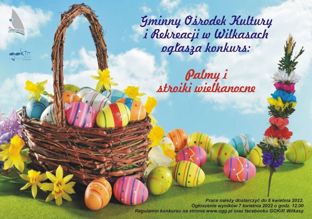 Gminny Ośrodek Kultury i Rekreacji w Wilkasach ogłasza kolejną edycję konkursu na najpiękniejsze palmy i stroiki wielkanocne, który skierowany jest do wszystkich uczniów szkół podstawowych, kół gospodyń wiejskich, stowarzyszeń, rodzin oraz świetlic z terenu gminy Giżycko.