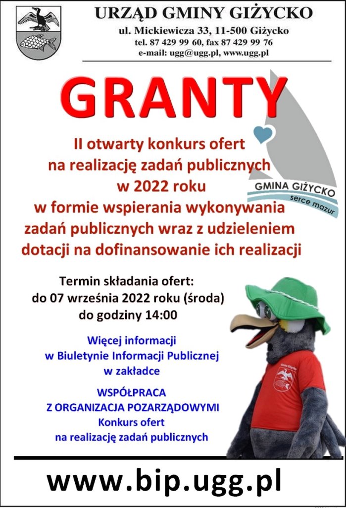 Wójt Gminy Giżycko ogłosił II otwarty konkurs ofert na realizację zadań publicznych w 2022 roku w formie wspierania wykonywania zadań publicznych wraz z udzieleniem dotacji na dofinansowanie ich realizacji.