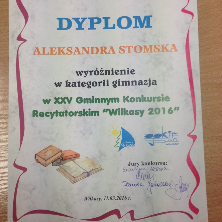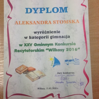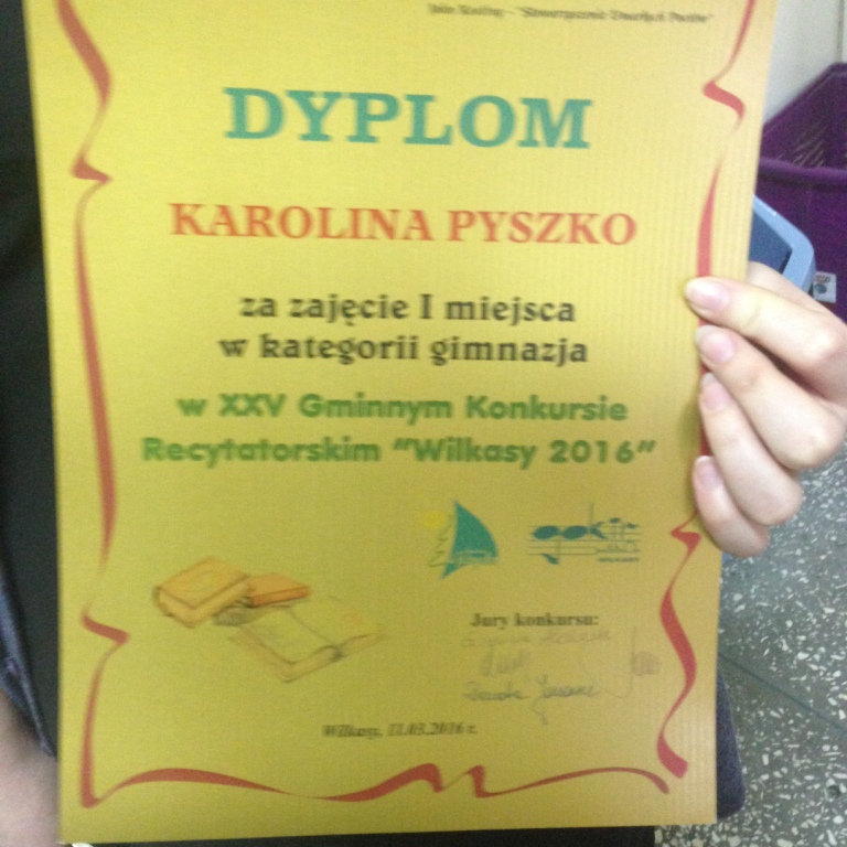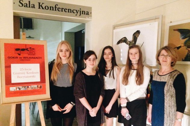 W piątek,  11 marca 2016 r. odbył się jubileuszowy, 25 konkurs recytatorski. Poprzeczka zawieszona była bardzo wysoko, a uczennice Publicznego Gimnazjum im. Szarych Szeregów w Wilkasach spisały się znakomicie zajmując wszystkie miejsca na podium oraz wyróżnienia.  I miejsce zdobyła Karolina Pyszko, II miejsce zajęła Martyna Harasimowicz – obie dziewczyny są z kl. III b. Na trzecim miejsce znalazła się Ania Harasim z klasy I a. Natomiast wyróżnienie otrzymała Aleksandra Stomska, również uczennica klasy III b. Opiekunką tej grupy jest p. Jolanta Dulko.