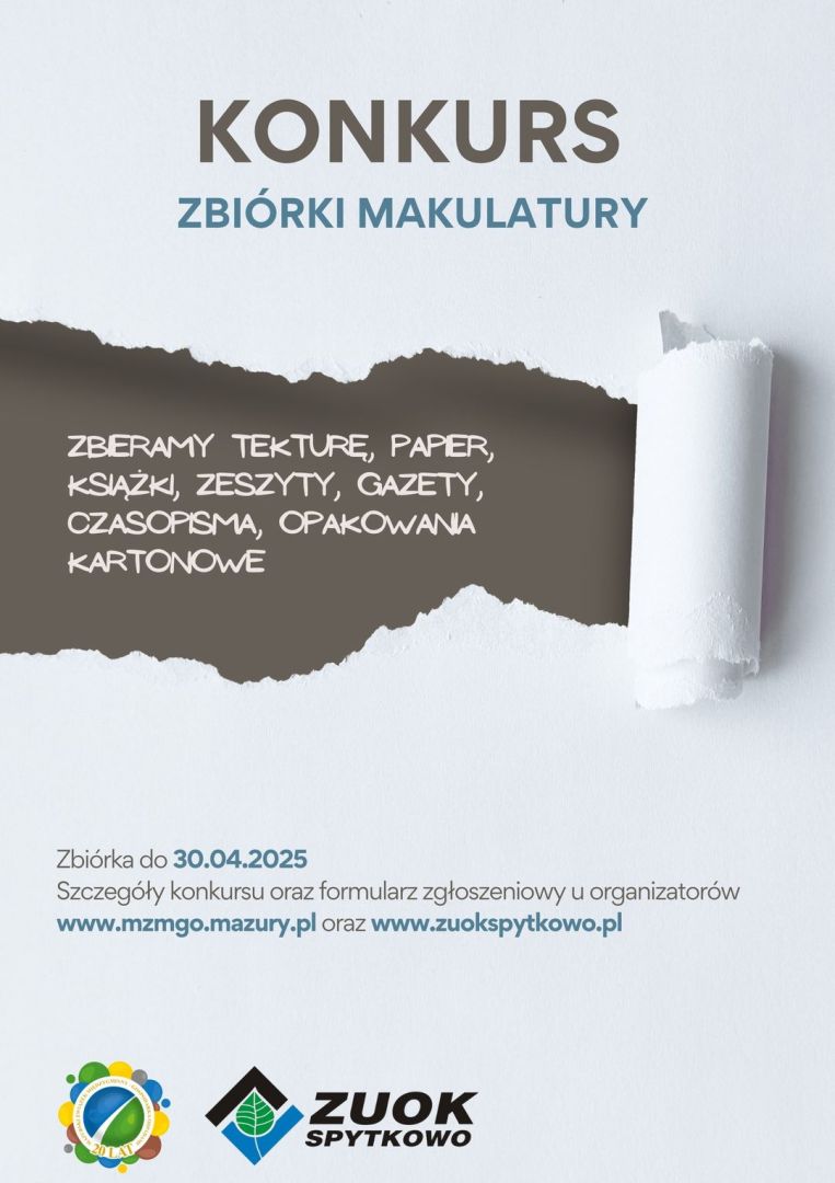 Mazurski Związek Międzygminny – Gospodarka Odpadami ogłosił konkurs zbiórki makulatury. Wspólnie z ZUOK Spytkowo zbierają tekturę, papier, książki, zeszyty, gazety, czasopisma, opakowania kartonowe.