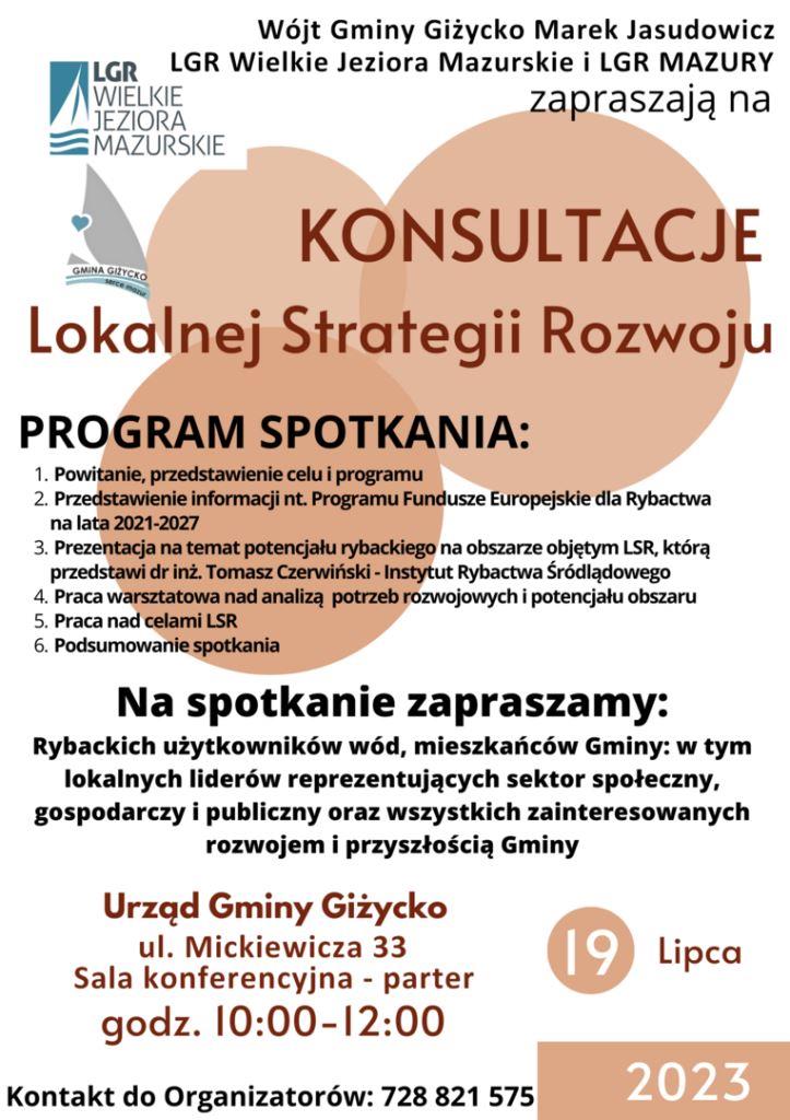 Wszystkich mieszkańców zainteresowanych rozwojem i przyszłością Gminy Giżycko, lokalnych liderów reprezentujących organizacje pozarządowe: stowarzyszenia, fundacje i inne inicjatywy obywatelskie, przedsiebiorców oraz rybackich użytkowników wód zaprasza Wójt Gminy Giżycko, LGR Wielkie Jeziora Mazurskie oraz LGR MAZURY na konsultacje Lokalnej Strategii Rozwoju.