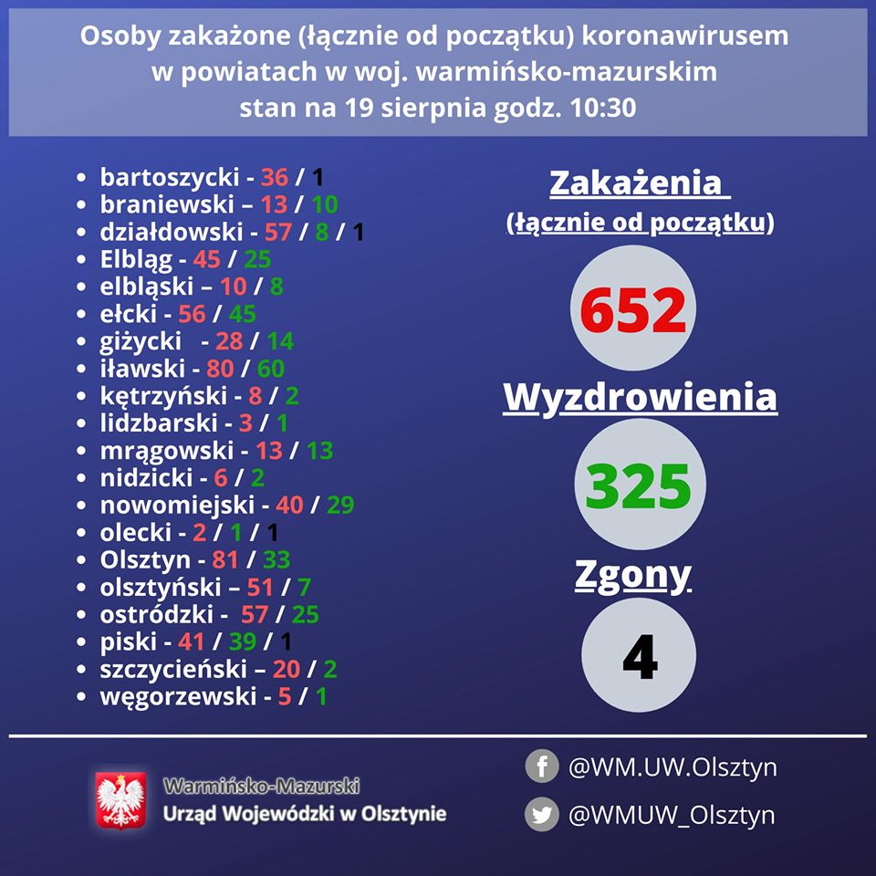 Urząd Wojewódzki w Olsztynie poinformował o 21 nowych zakażonych osobach w województwie Warmińsko-Mazurskim.