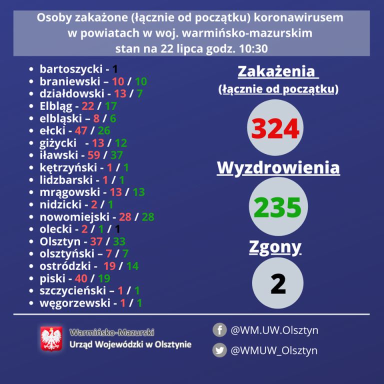 W sumie od początku epidemii na Warmii i Mazurach potwierdzono 324 przypadki zakażenia Sars CoV-2. Dwoje chorych zmarło. Wyzdrowiało 235 osób.