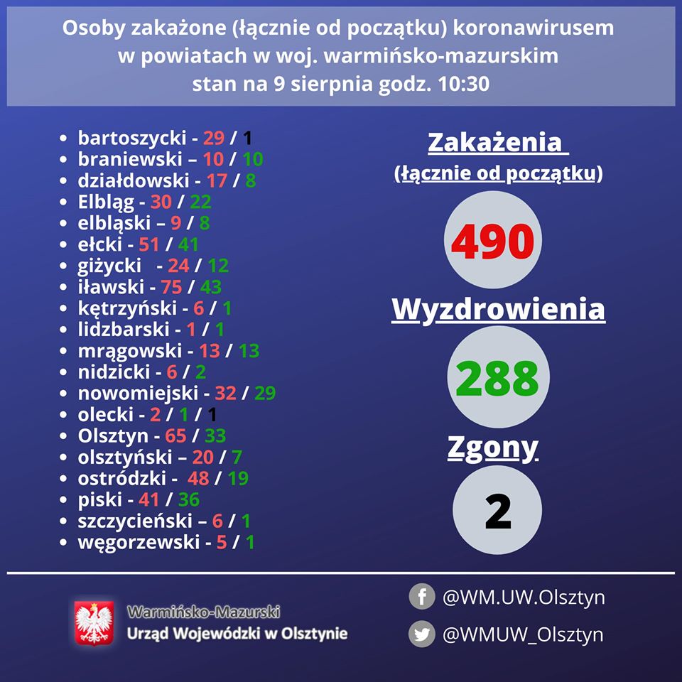 Zakażenie SARS-CoV-2 zdiagnozowano u 20 osób z powiatu bartoszyckiego – 3 starsze kobiety, 3 kobiety w średnim wieku, 2 dziewczynki, 2 starszych mężczyzn, 9 mężczyzn w średnim wieku, 1 młody mężczyzna, 2 osób z Olsztyna – kobieta w średnim wieku, młoda kobieta, 2 osób z powiatu ostródzkiego – starszy mężczyzna, dziewczynka, 1 osoby z powiatu nowomiejskiego – młody mężczyzna, 1 osoby z powiatu piskiego – starsza kobieta, 1 osoby z Elbląga – starszy mężczyzna, 1 osoby z powiatu olsztyńskiego – starsza kobieta, 2 osób z powiatu węgorzewskiego – starsza kobieta, mężczyzna w średnim wieku.